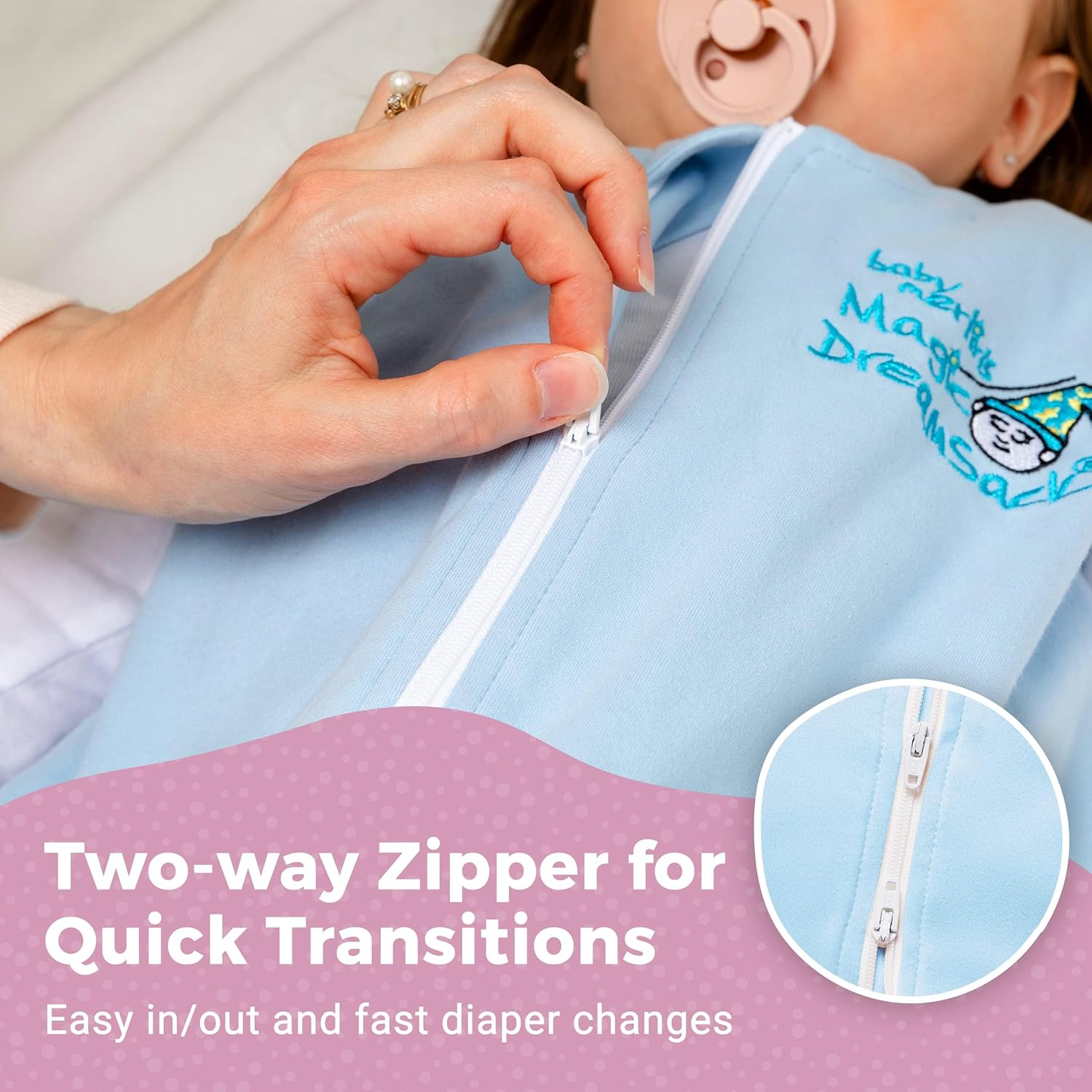 - EASY DIAPER CHANGES – Double zippers allow for quick and convenient diaper changes, while open hands and feet help support comfort and self-soothing.