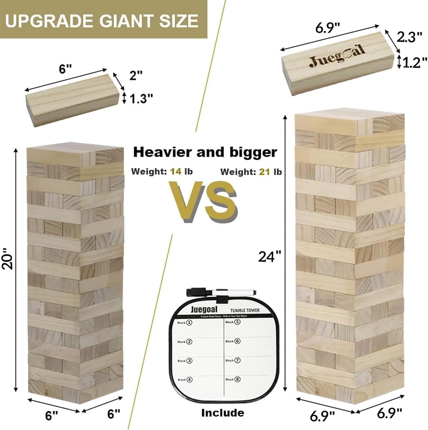 - SUPER FUN: This giant tumble tower suitable for people of all age, great game for indoors and outdoors, perfect for family gathering, picnics, birthdays, parties and everyday backyard fun! Includes 54 tumble tower blocks, each block is 6.9 x 2.3 x 1.2 inch.