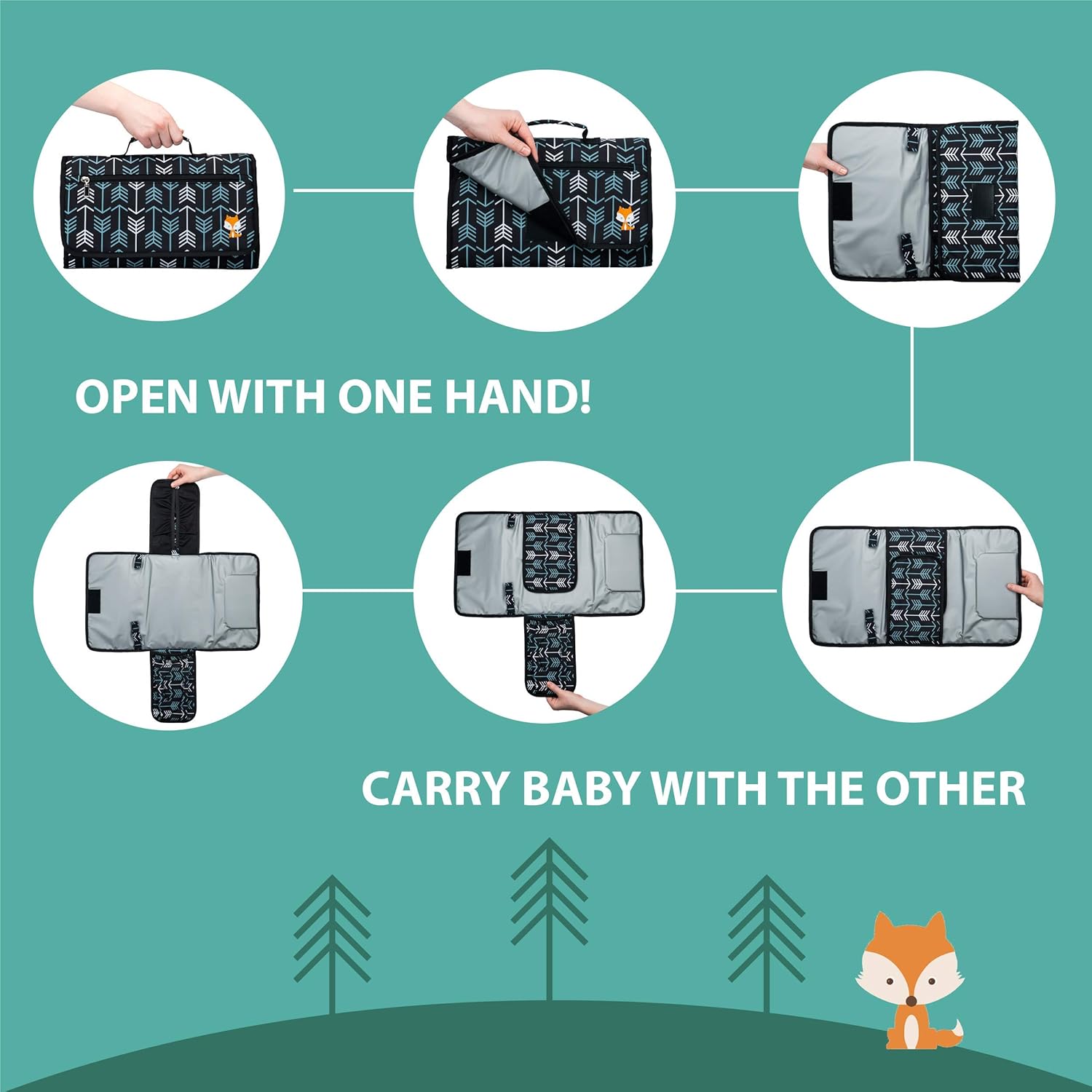 - SINGLE HANDED CONVENIENCE: With its rapid-open hook and loop fastener, customized 100x Wipes Pocket, minimum 5x Diapers Pocket and Zippered “Foxy Lil Things” Pocket -- the Lil Fox Portable Diaper Changing Pad is the only pad that leaves you one hand to hold baby, and the other for their changing mat for a quick nimble change!