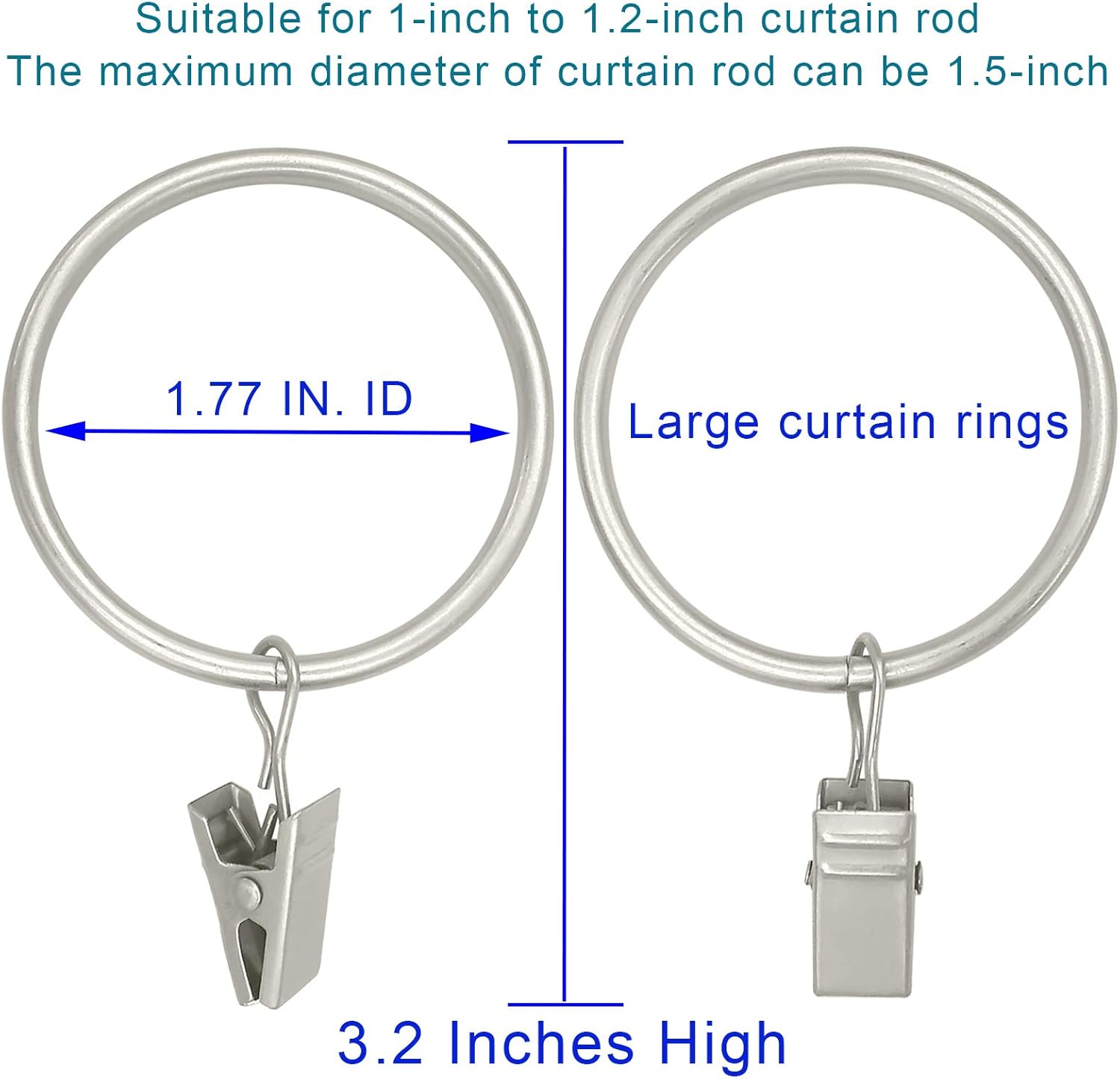 - 【Please Note】This rings fits 1.5 in or smaller diameter drapery rod, The clip is a little tight when it is opened for the first time, and it will be easy to open it when it is used again.