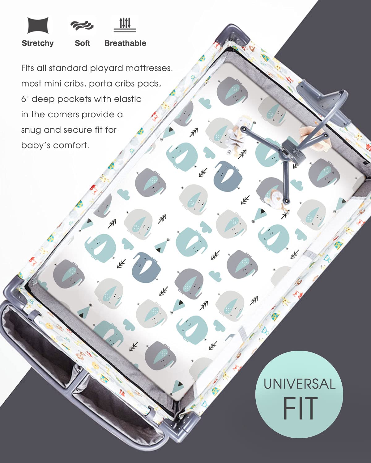 - Apple It Within Seconds: Thanks to the elastic bottom, our pack n play sheets come in a classic, Cute elephant print that will put the finishing touches to any bedding. Make sure to give your darling a serene and calm bed to rest in.
