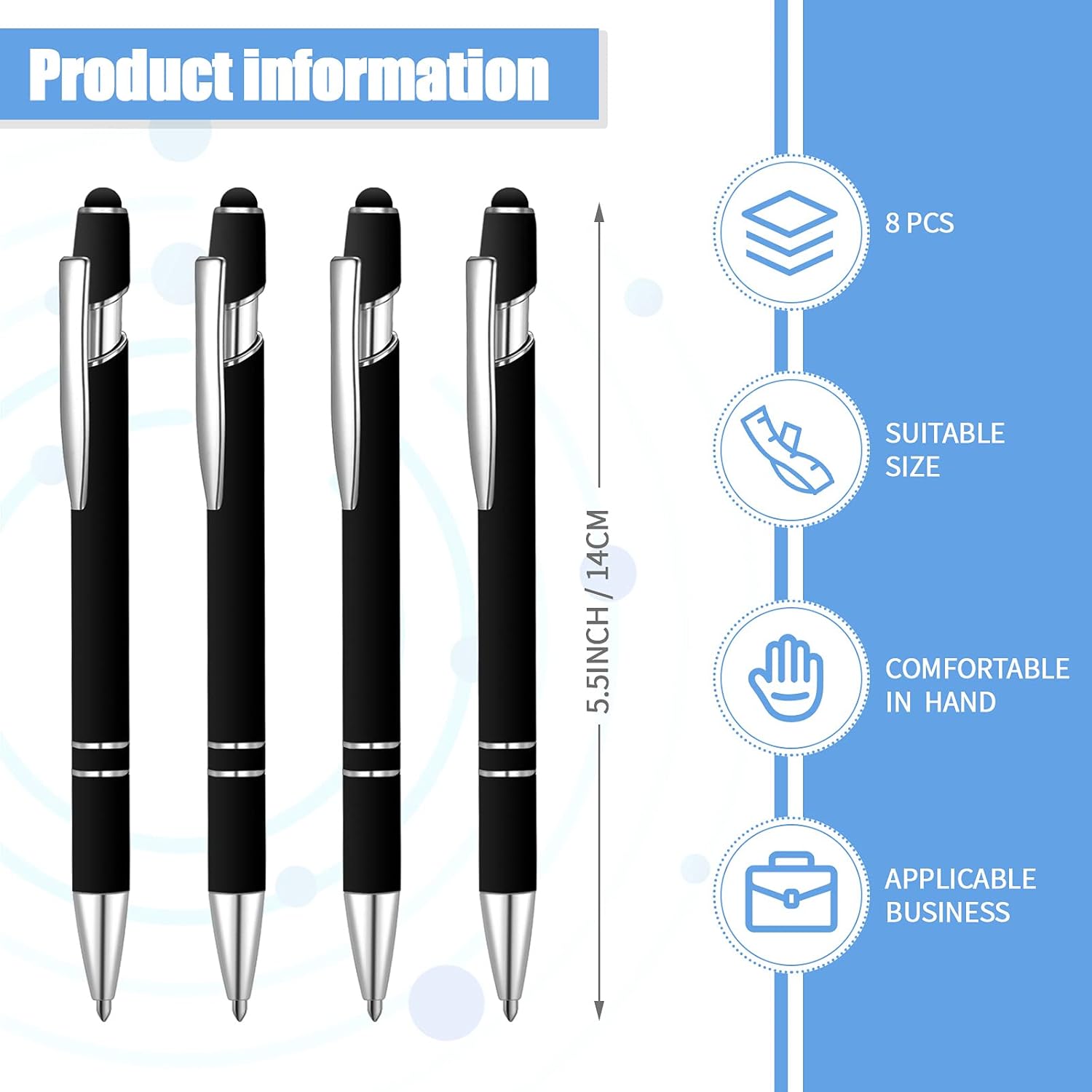 8 Pieces Ballpoint Pen with Stylus Tip Black Ink 2 in 1 Stylus Metal 1.0 mm Medium Point Smooth Pen Rainbow Colorful Rubberized Ballpoint for Touch Screen Tablet(Black)