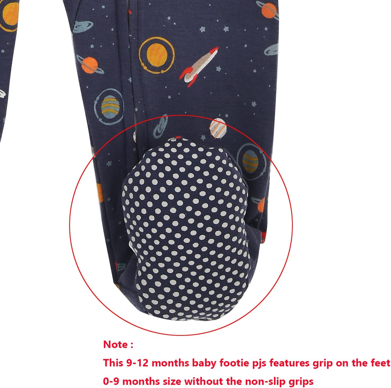 • 【Built-in Mittens and Footed】All sizes design with reversible mitten hand covers to prevent baby from scratching themselves. This 9-12 months baby footie pjs features grip on the feet for extra stability. Great for little baby on the move(0-9 months size without non-slip grips)