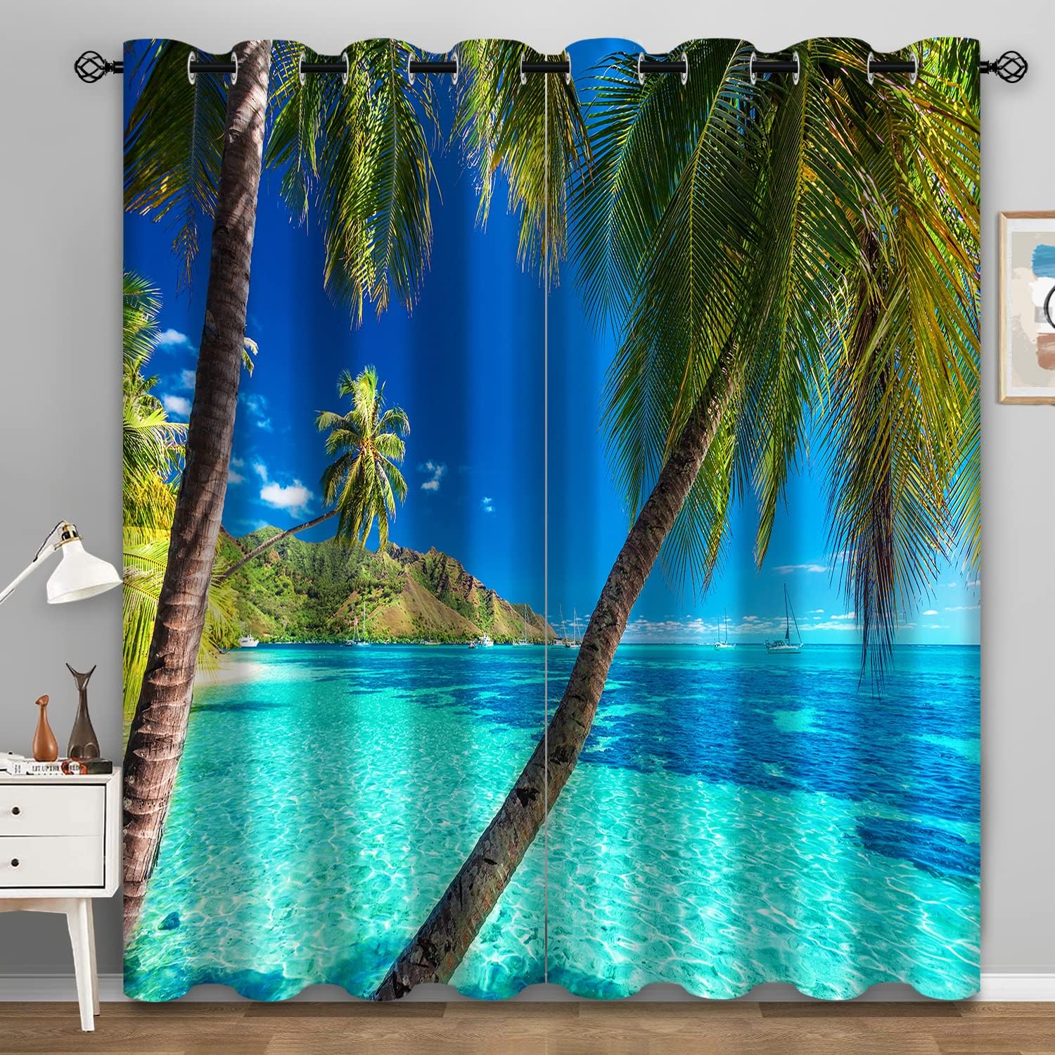 Aimego Palm Trees Blackout Curtains Blue Ocean Tropical Hawaiian Scenery Window Drapes Decor for Bedroom Living Room Grommet Top Room Darkening Curtains 2 Panel Set, 52"X63"