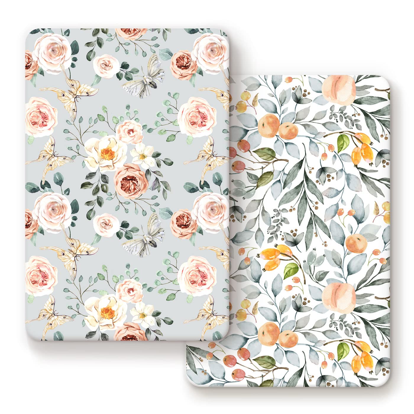 GRSSDER Stretchy Ultra Soft Jersey Knit Fitted Pack n Play Sheets Set 2 Pack, Portable/Mini Crib Sheets for Girls, Watercolor Flowers and Fruits