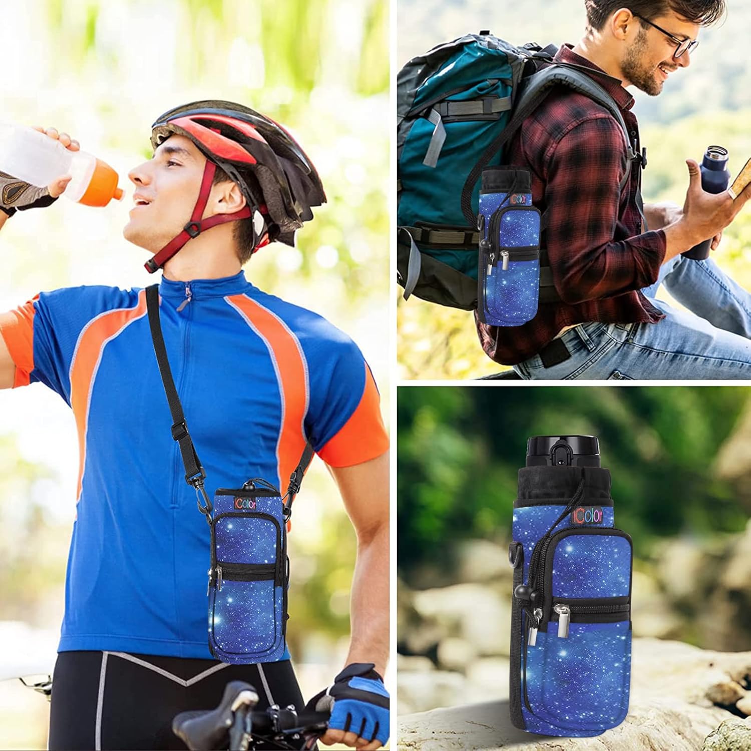 - icolor Sports Wide Mouth Bottle Accessories for Hiking Travelling Camping: Have Adjustable Padded Shoulder and Handle Strap. It is with 2 zipper Pockets too,The small zipper pocket is for cash and card, the large zipper pocket is for smartphone, keys & other.