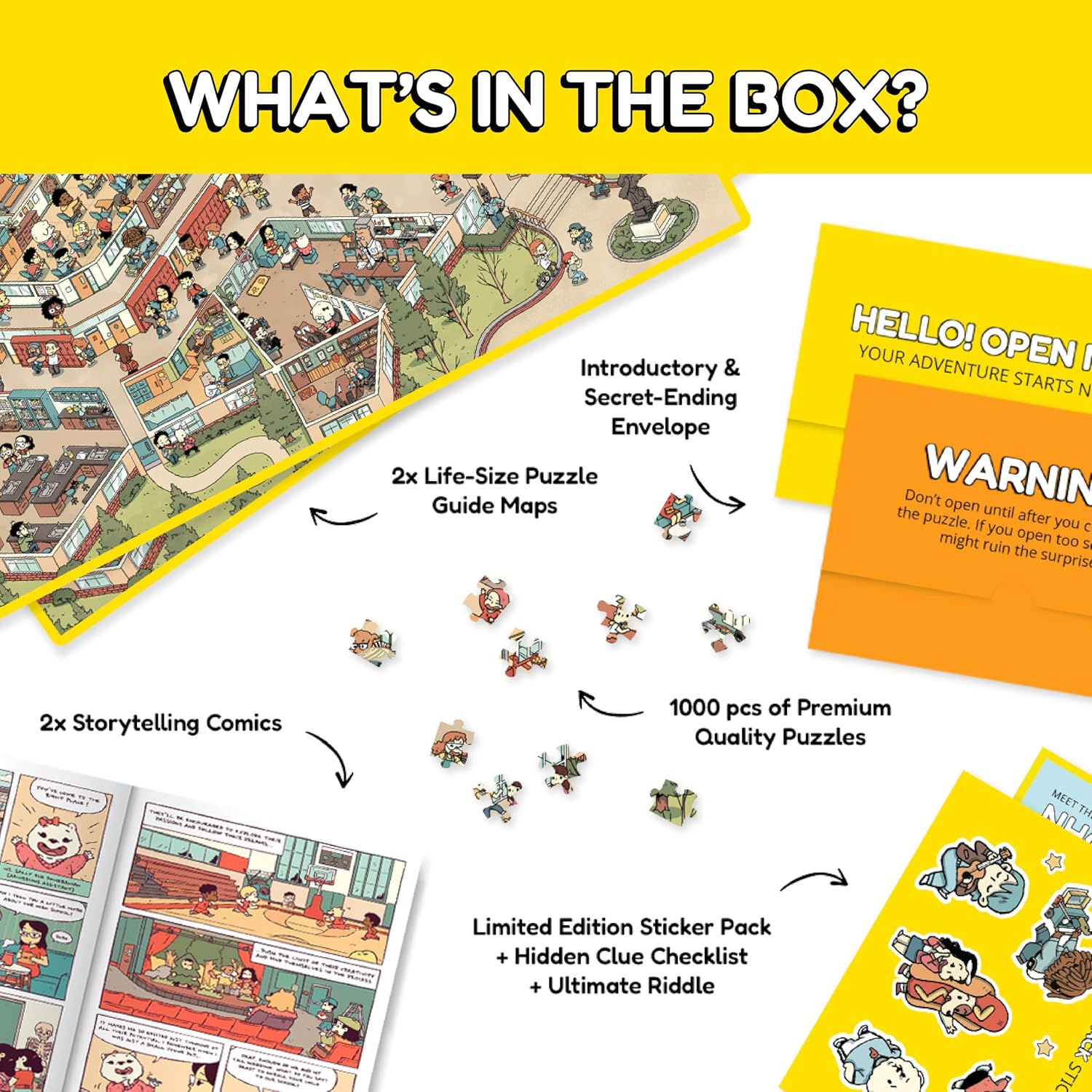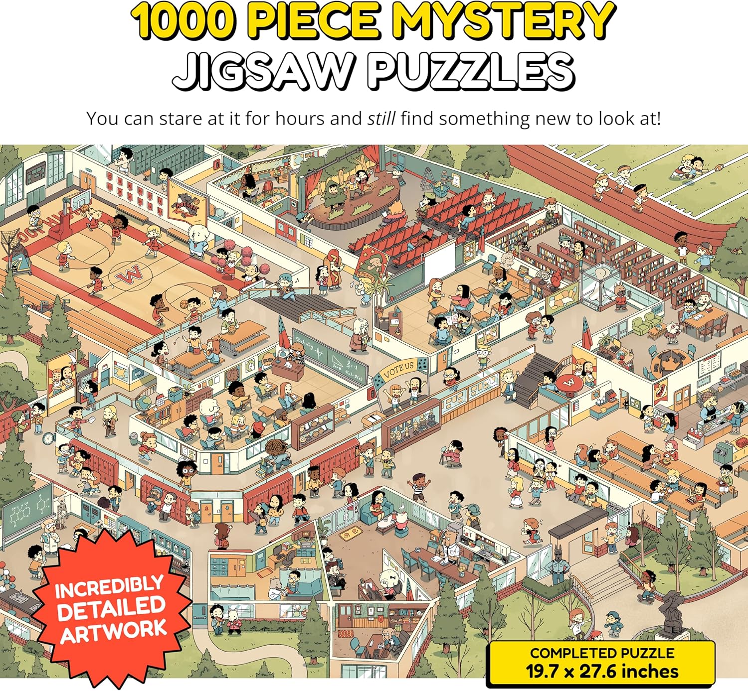 - Jigsaw Puzzle with a Twist - The box shows one picture, but the final scene is different! This 1000 piece mystery puzzle reveals hidden jokes, playful surprises, and a story-driven ending as you build.