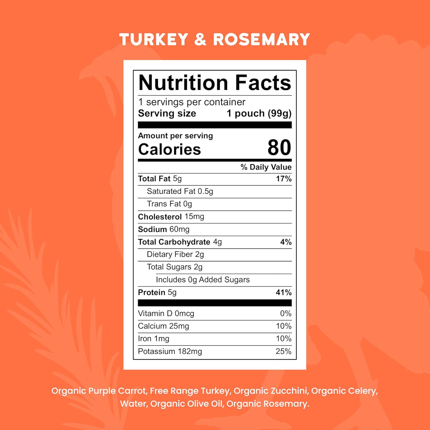 - FREE RANGE TURKEY & VEGGIES: Dive into six pouches of baby food purees featuring free-range turkey, organic purple carrots, celery, and zucchini. Boosted with healthy fats from organic olive oil and balanced with a hint of organic rosemary, these are perfect for your baby meat pouch needs