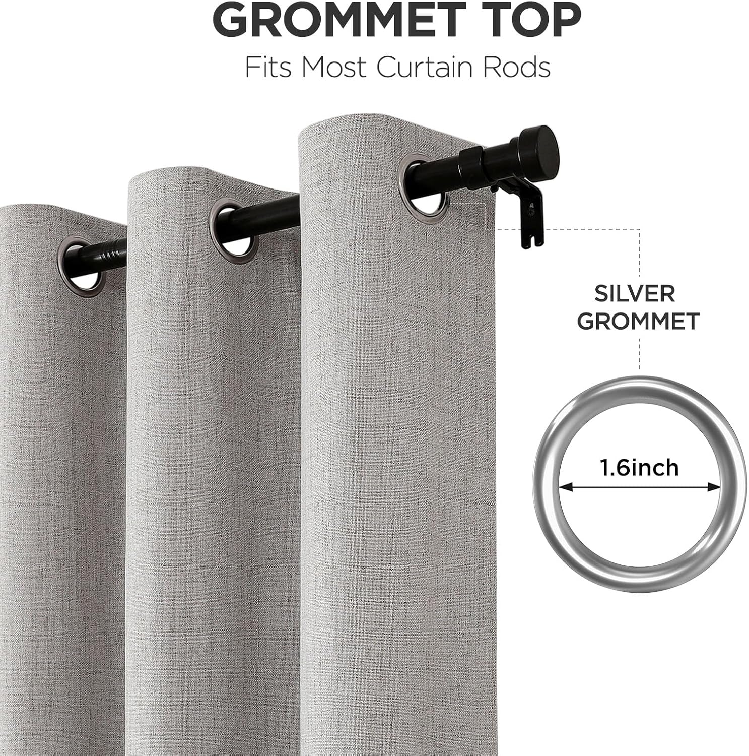 - Smooth-Glide Grommet Design: The room darkening curtains are designed with Grommets. This design adds a metal ring at the top of the curtain to make it easier to slide and distribute the weight of the curtain fabric evenly. 8 metal grommets per sun blocking curtains ensure effortless sliding on rods up to 1.5" diameter. Evenly distributes fabric weight while adding modern sophistication to bedrooms, offices, or living rooms (Rods not included)