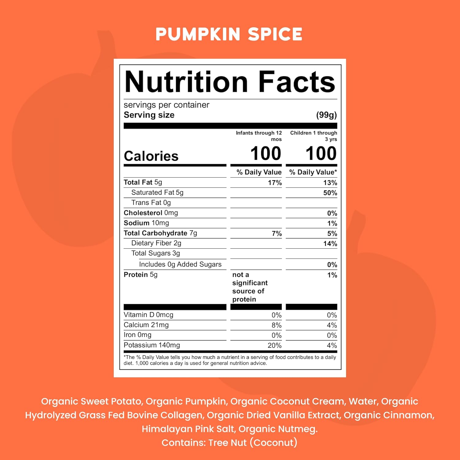 - ORGANIC INGREDIENTS: Made with organic pumpkin, organic sweet potato, and grass-fed bovine collagen, this dairy free pumpkin spice protein smoothie pack is a tasty and healthy treat for your toddler