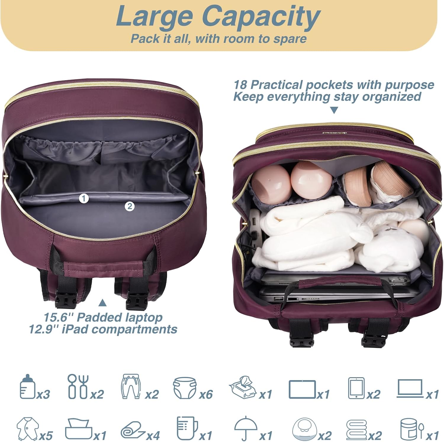 - Convenient and Thoughtful: Baby diaper bag features 15.6’’ padded laptop pocket and 12.9’’ iPad pocket in the main compartment, USB charging port, 2 built-in stroller straps, waterproof pocket, back anti theft pocket, dual zippers for easy access and closure even with one hand! Also we have added a luggage sleeve on the back so it can easily slide over a carryon luggage while on the go.