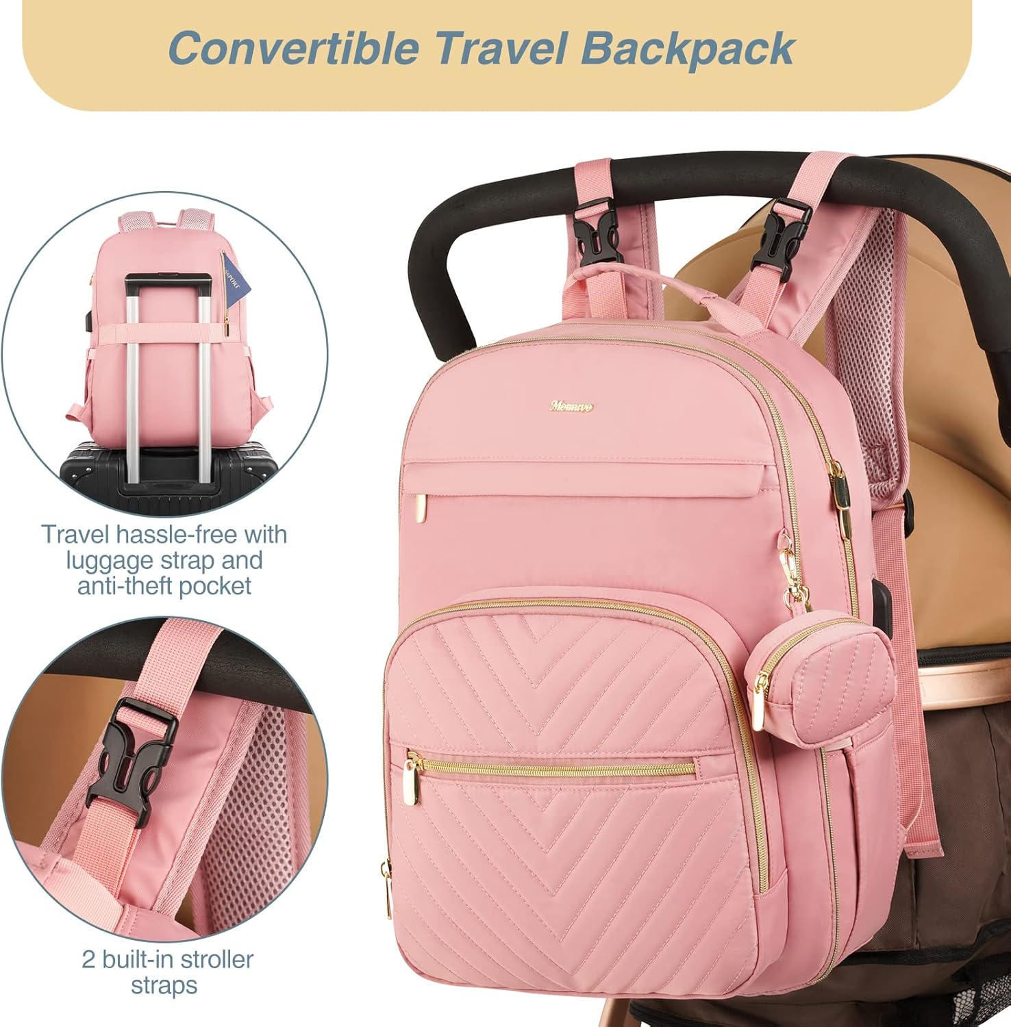 MOMUVO Diaper Bag Backpack, Quilted Baby Bag with Changing Pad & Stroller Straps & Pacifier Case, Large Travel Diaper Bags for Mom Dad, Pink