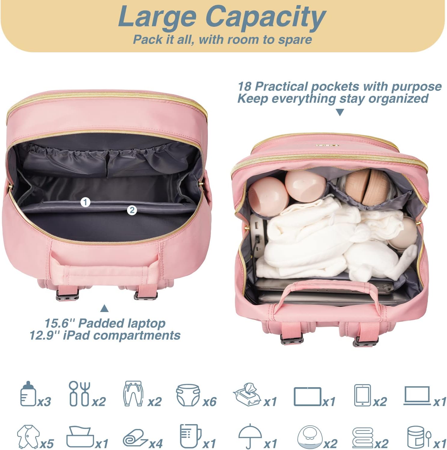 - Convenient and Thoughtful: Baby diaper bag features 15.6’’ padded laptop pocket and 12.9’’ iPad pocket in the main compartment, USB charging port, 2 built-in stroller straps, waterproof pocket, back anti theft pocket, dual zippers for easy access and closure even with one hand! Also we have added a luggage sleeve on the back so it can easily slide over a carryon luggage while on the go.