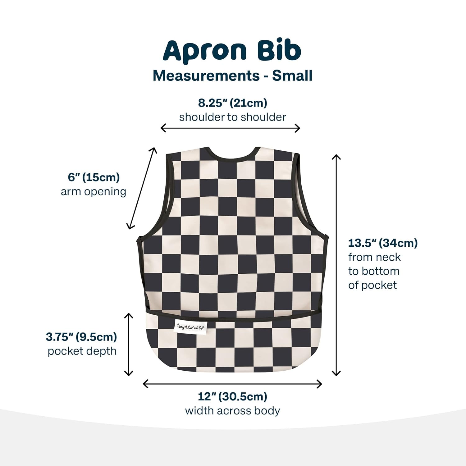 Tiny Twinkle Mess Proof Baby Bib - Waterproof & Lightweight Baby-Led Weaning Apron | 100% Recycled Polyester, Easy Clean & Machine Washable (Black Checkers, Small 6-24 Months)