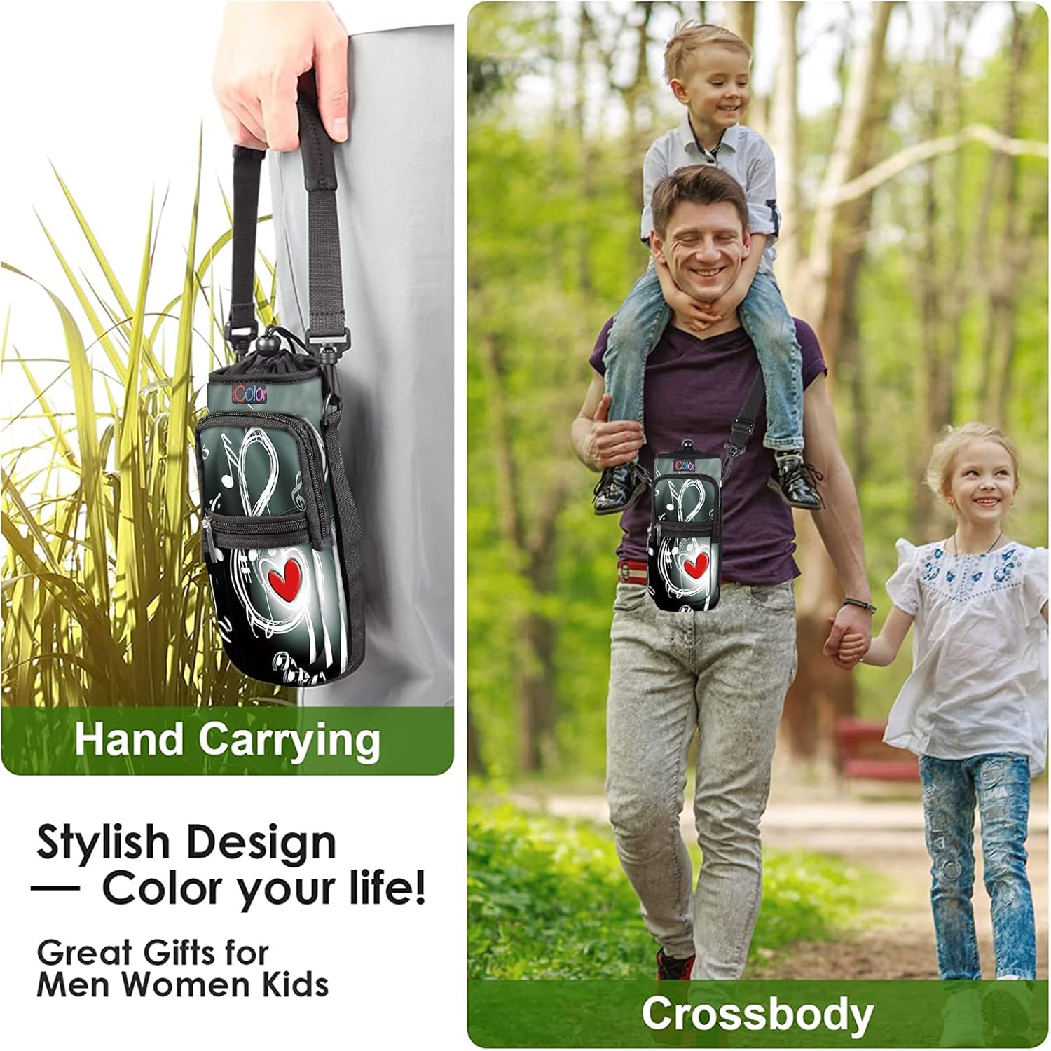 - icolor Water Bottle Carrier with Call Phone Holder Sling Shoulder Bag make of thick 4mm Soft Neoprene material,lightweight & comfortable,it will fully effectively bottle surface from being scratched,scraping,extrusion and so on.