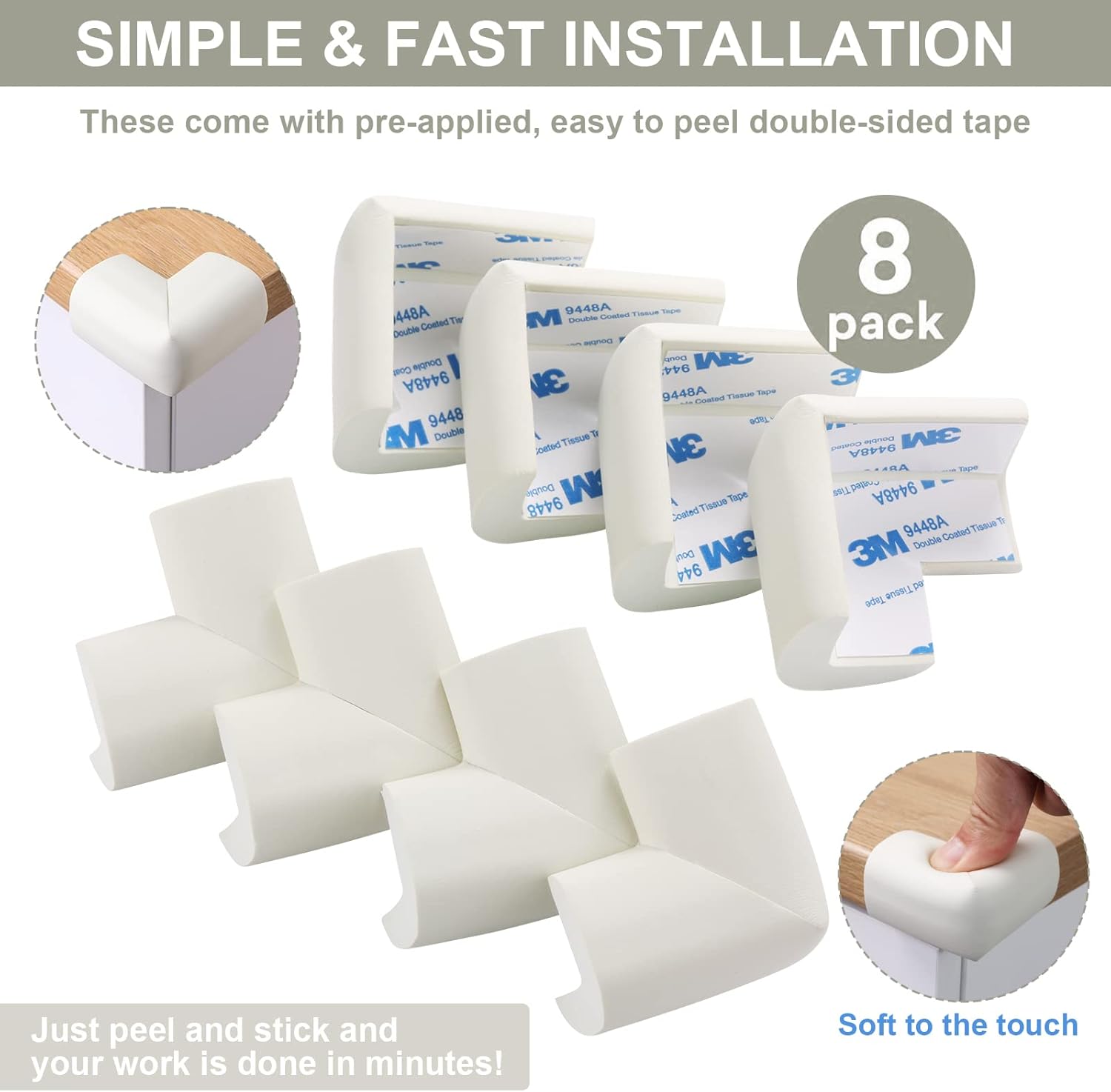 - Easy to Install : corners are soft sponge ,the color matches most of furniture , Safety Corner Guards come pre-taped using double sided adhesive , All you need to do peel off the tape and stick it to the corner that you need to protect. and press for one minute. Clean the surface before installation to ensure that there are no dust, water, oil, and do not move the corner protector within 24 hours of installation. Edge Protectors suit for Sharp Corners of Cabinets, Tables, Drawers