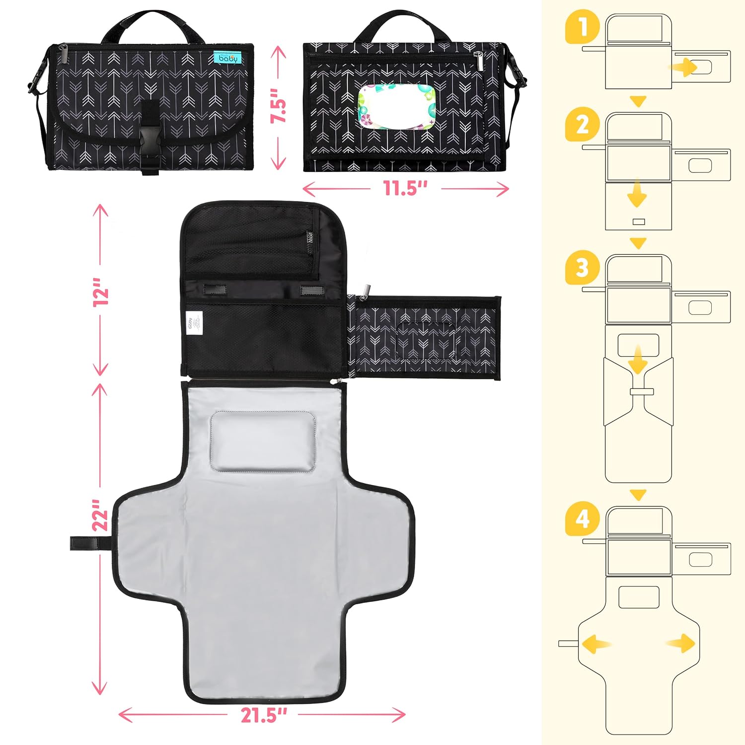 Kopi Baby Portable Diaper Changing Pad - Baby Diaper Changer Travel Bag with Wipes Pocket, Smart Design Portable Changing Mat, Infant Travel Station Kit, Gift for Newborn - Black Arrows, Classic