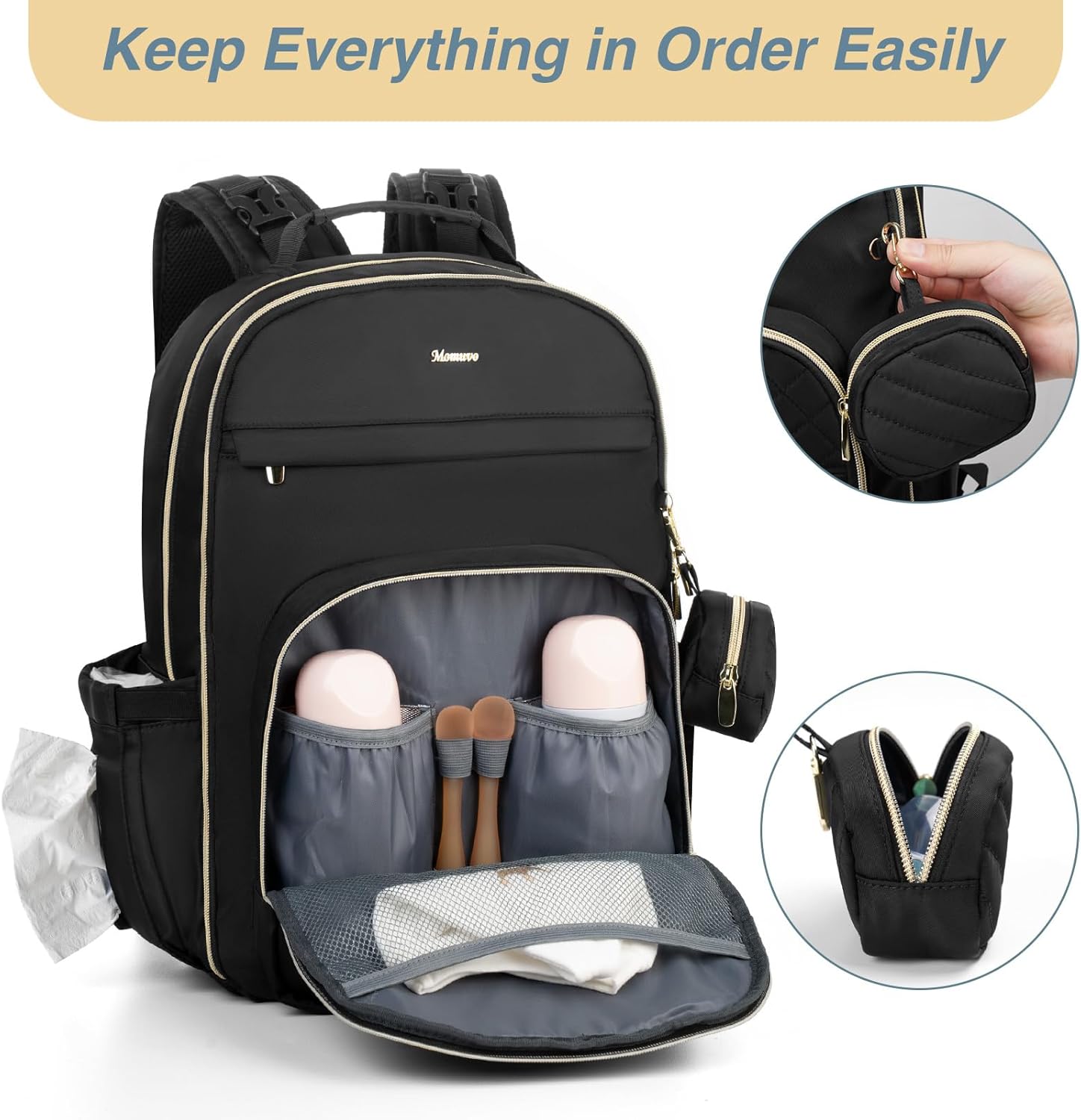 MOMUVO Diaper Bag Backpack, Quilted Baby Bag with Changing Pad and Stroller Straps and Pacifier Case, Large Travel Diaper Bags for Mom Dad,Black