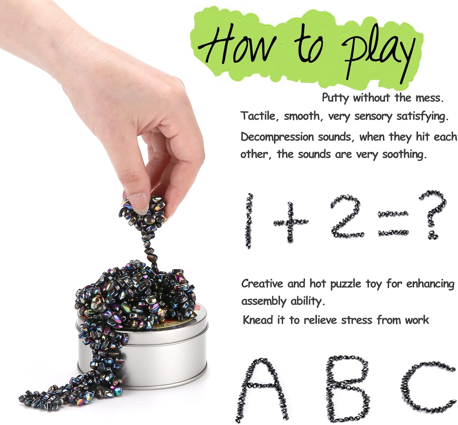 - Desk Toys Features: Smooth and irregular small particles, like puddy, are attracted to each other. The size of each is about 0.7cm, and it is hand-polished. It is almost impossible to find 2 pieces that are exactly the same. The quantity in a box is about 550 PCS putty, which is enough to play.