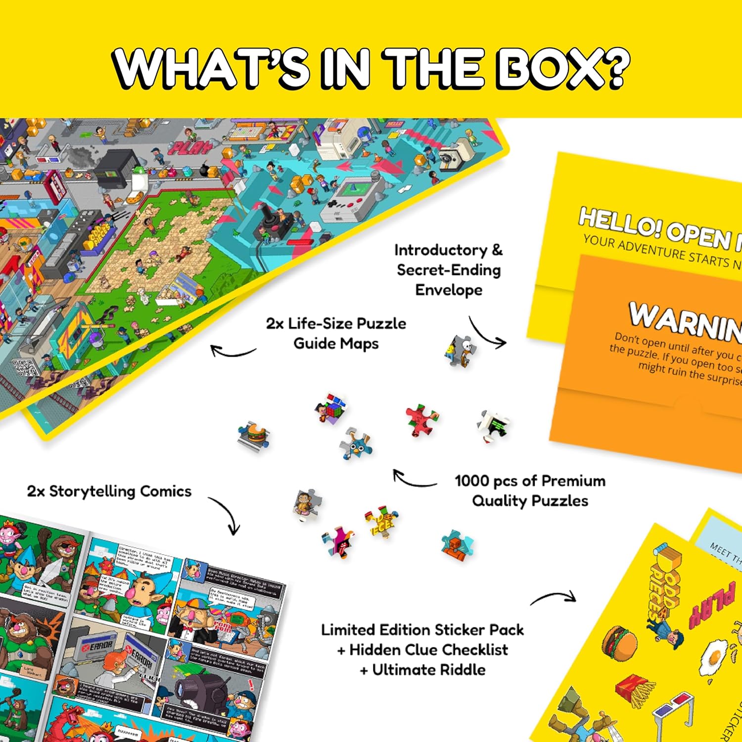 - Jigsaw Puzzle with a Twist - The image on the box isn’t the final scene! This 1000 piece mystery puzzle changes as you build, revealing hidden surprises and a totally unexpected ending.