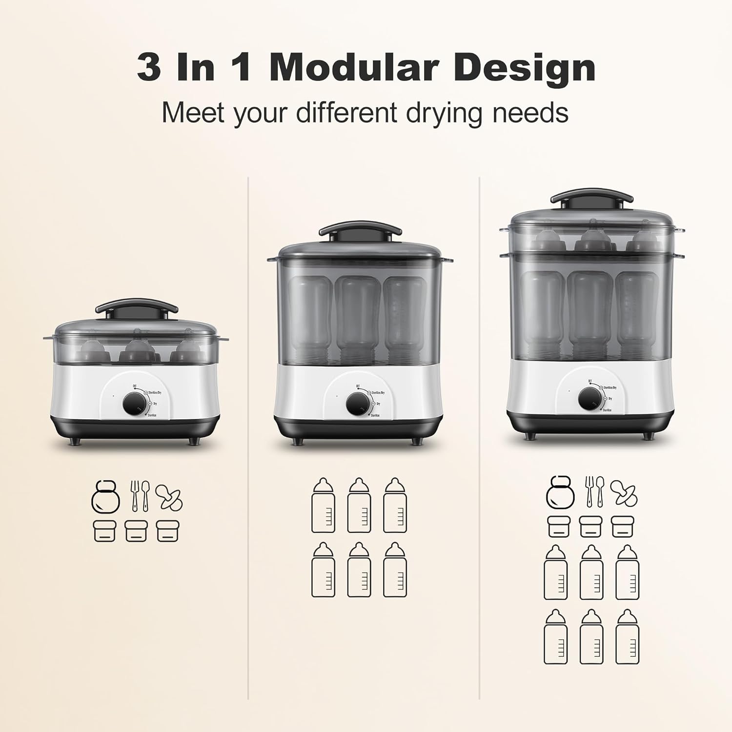 - 【Large Capacity】 Set-up the baby steamer and dryer with three different stacking options to clean up to 6 bottles and accessories like teethers, pacifiers, and plastic toys at once. It is designed to fit all bottles perfectly.