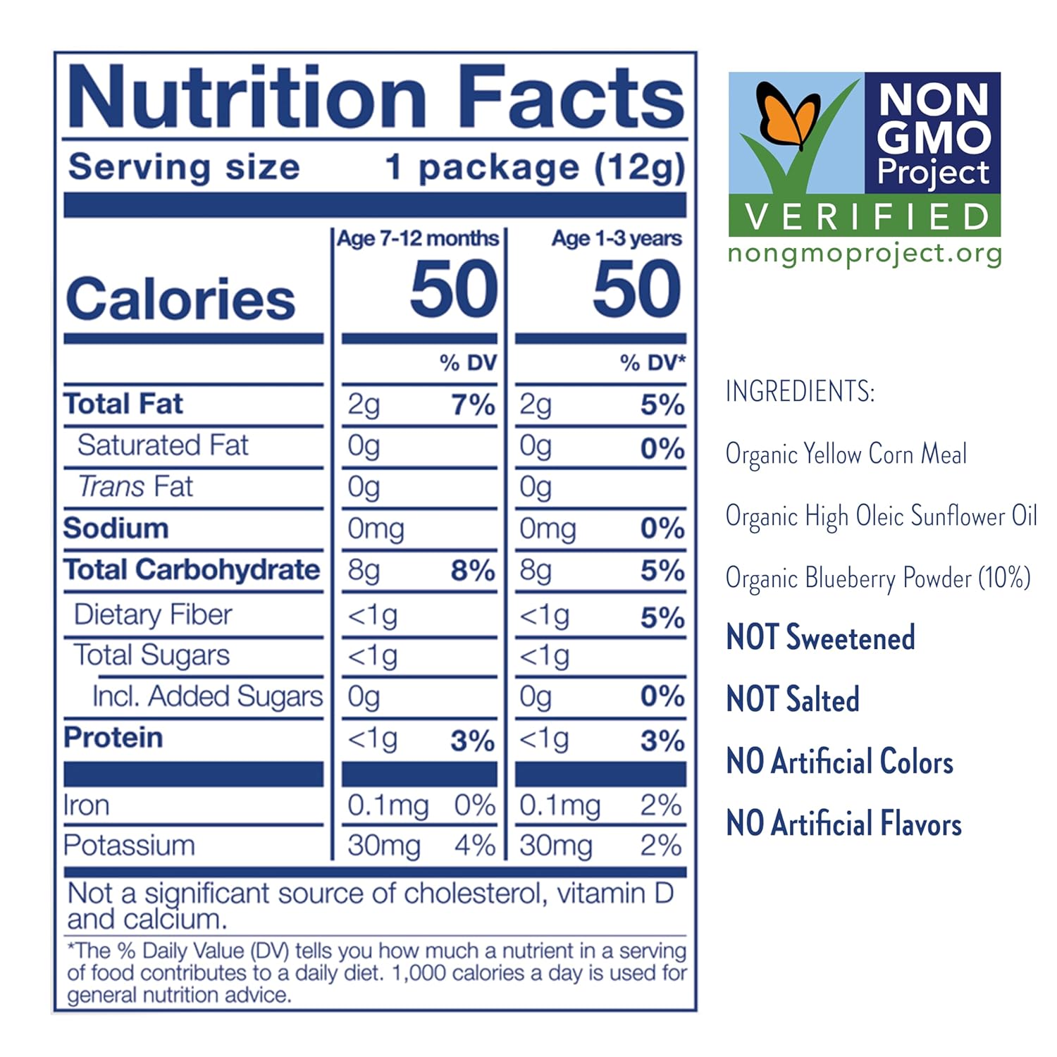 - Deliciously crisp organic puffed corn snacks sprinkled with blueberry that melt in the mouth for safe self-feeding.