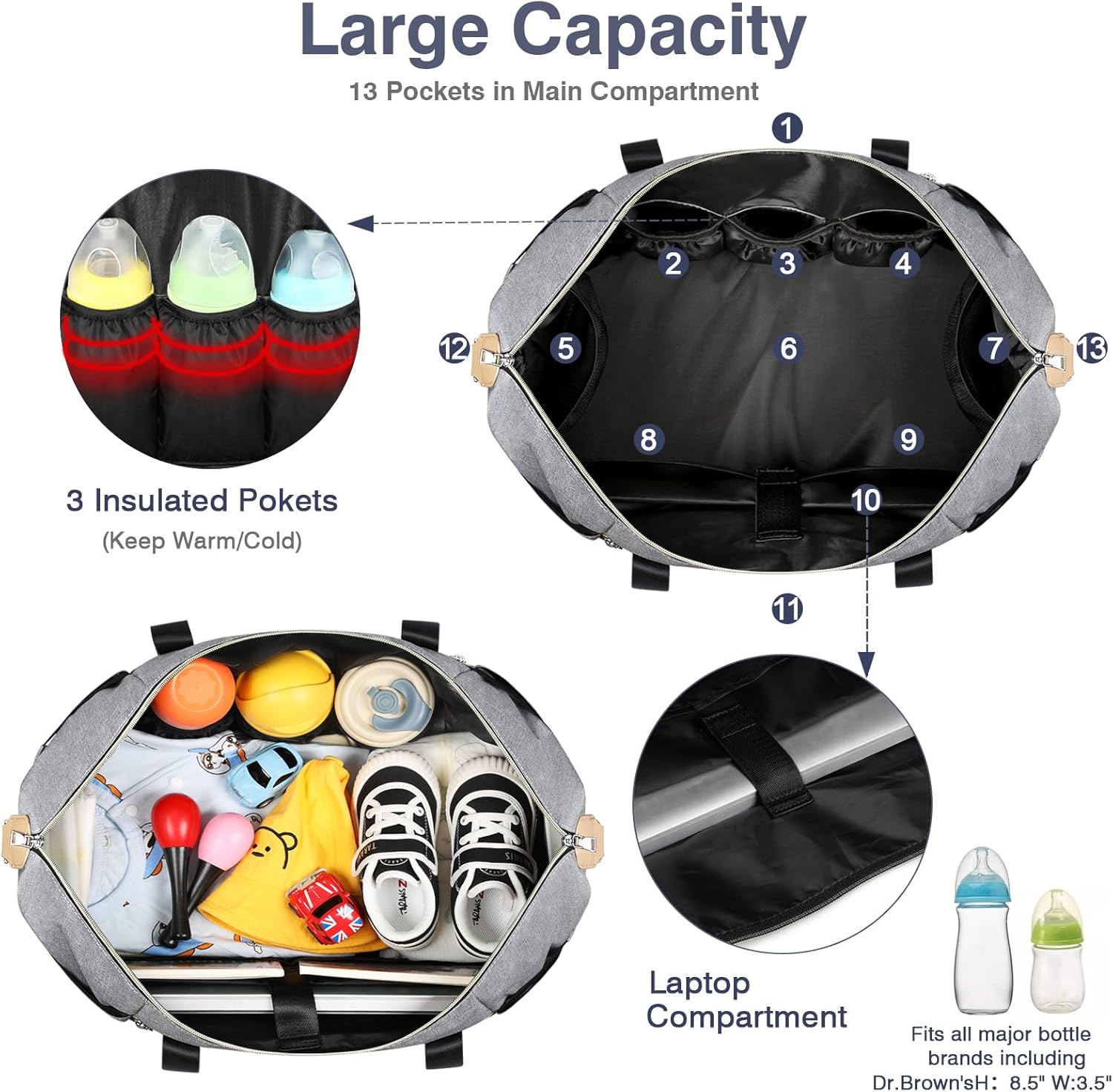 - Large Capacity & Multi-Pocket: Multifunctional pockets for newborn baby essentials including a main compartment, a front pocket, a back zipper pocket, 3 insulated pockets and 8 easy-access pockets inside for bottles, diapers, or wipes. Two sides pocket, wipes can be easily extracted from a hole in the outer layer. When you need to put something else, you can use velcro to prevent things from falling. Say goodbye to searching crazily in the bottom of your diaper bag for that one lost item.