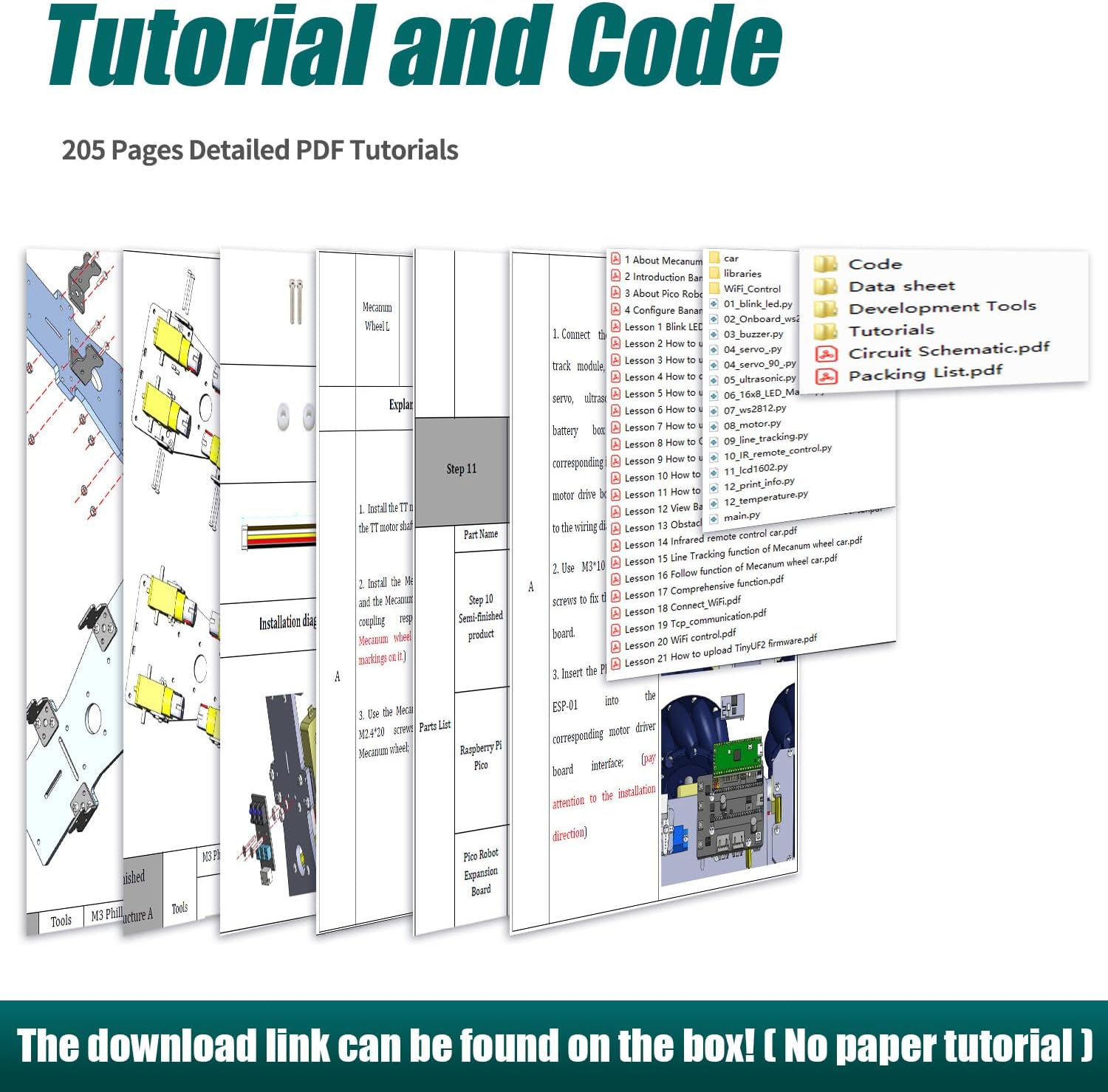 - 【Easy to Assemble and Build】 Detailed tutorials(205 Pages, 27 Lessons) and complete Python code are provided. The download link can be found on the card in the box (Paper tutorials are NOT available as the tutorials are updated frequently).