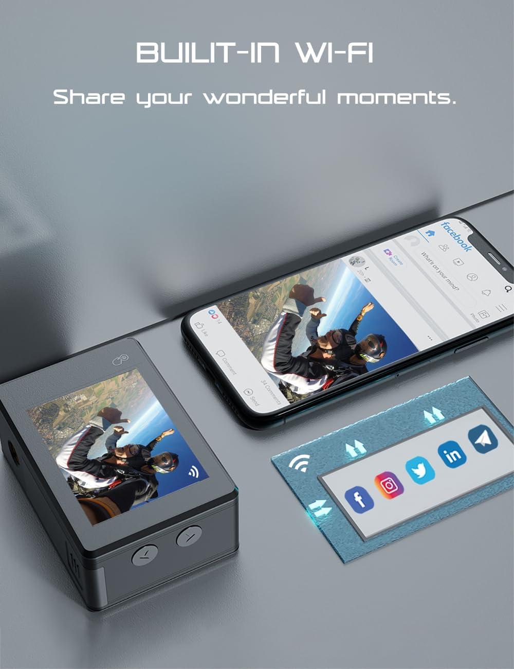 - đ¸ăDouble Screen & Touch ScreenăApexcam X70PRO go pro camera adopts an advanced double color screen design, which can freely switch between front and rear screens. The vivid 1.4 inch front screen is specially designed for your selfie needs, and the back is a 2-inch sensitive touchscreen that can respond quickly with the touch of a finger.