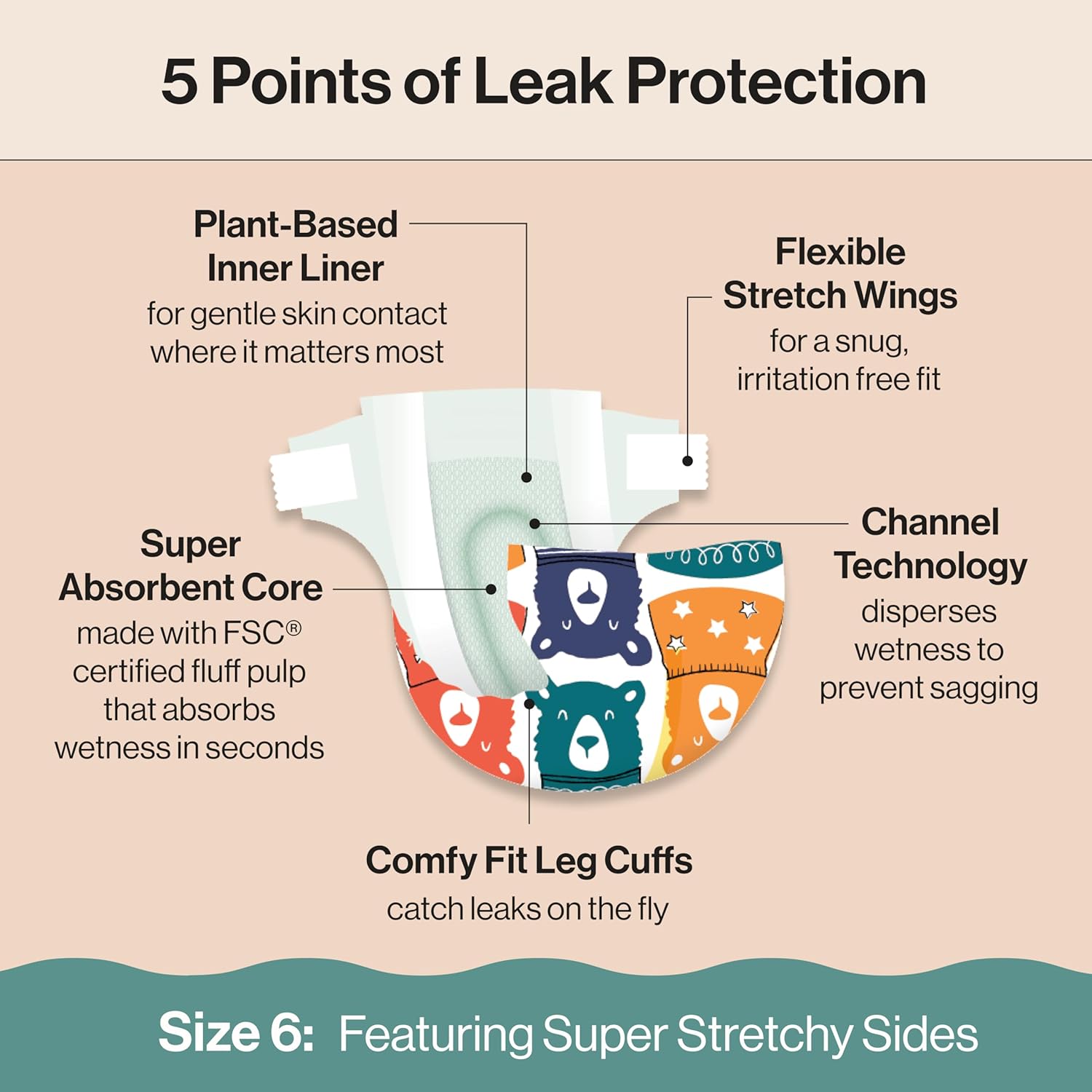 The Honest Company Clean Conscious Diapers for Delicate Skin | Up to 100% Leakproof | Hypoallergenic, Fragrance Free | Gender Neutral | Super Club Box, Size 6 (35+ lbs), 68 Count (Prints May Vary)