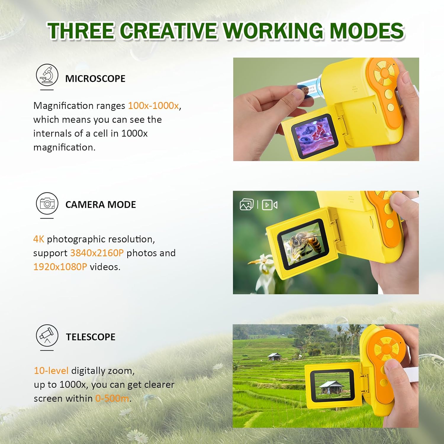- ๐ฏ-๐๐ป-๐ญ ๐๐ฒ๐๐ถ๐ด๐ป: 1) Microscope Searching, 2) One-Click Photo & Video Recording, 3) Telescope, choose what you want to enhance child's learning experience. And this digital microscope made of 4K resolution, provides much higher clarity