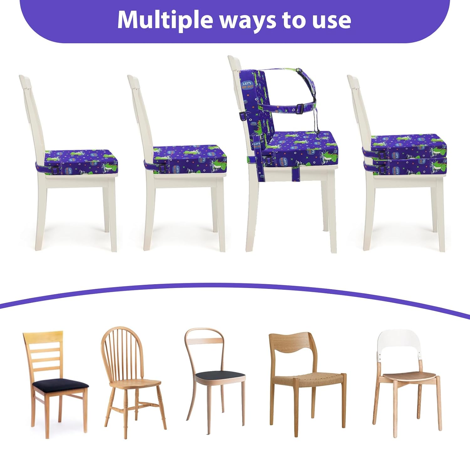 - ADJUSTABLE SEAT BELTS: Toddler booster seat for dining table is equipped with multiple adjustable safety belts, which can be securely fixed to the back and bottom of the chair. On the table the whole family used it with, baby had plenty of space for legs and could still reach the table without an issue. What's more, The five-point-buckle straps are secure enough that your baby won’t fall so you don’t have to worry about that