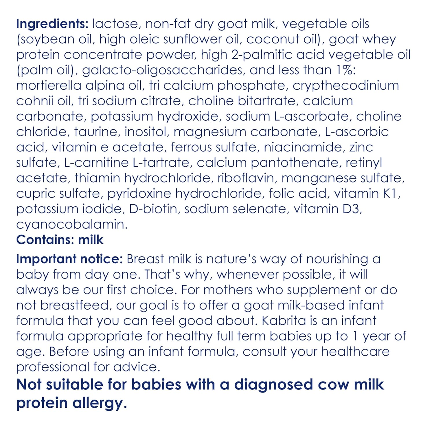 - Item Form : Kabrita Goat Milk-Based Infant Formula – 28oz – Pack of 2 – Natural, Gentle Baby Formula – European, Non-GMO – Ages 0-12 MonthsKabrita Goat Milk-Based Infant Formula – 28oz – Pack of 2 – Natural, Gentle Baby Formula – European, Non-GMO – Ages 0-12 Months See more