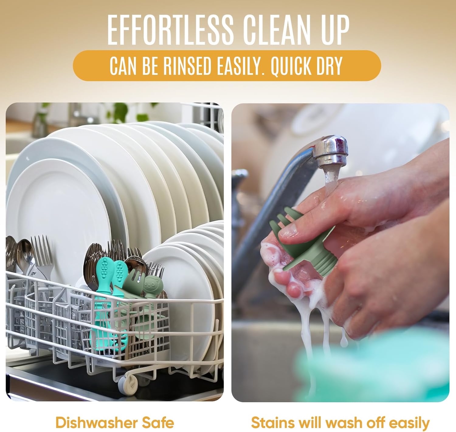 - EFFORTLESS CLEAN-UP: Made of high-quality food-grade silicone material, our baby silicone feeding set is very easy to clean up and will leave no stains. Simply, place the set in the dishwasher and they will come out clean and sanitized. These toddler spoons and forks are also lightweight and easy to hold, making it perfect for on-the-go meals.