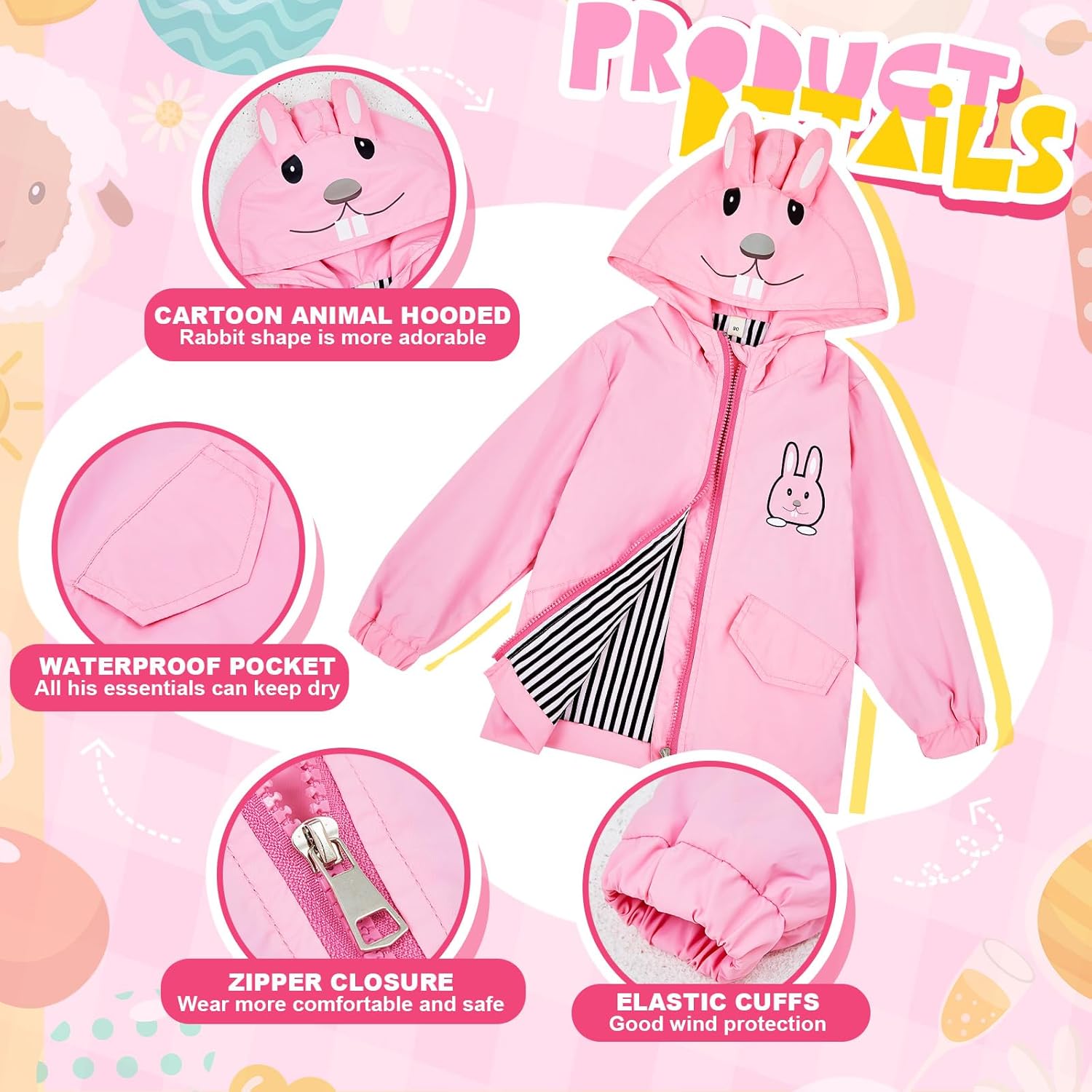 • Adorable Design and Color: our raincoat has a lovable rabbit design that adds a cute touch; The raincoat is lovely and vivid, and will make your toddler gets excited about wearing their rain coat