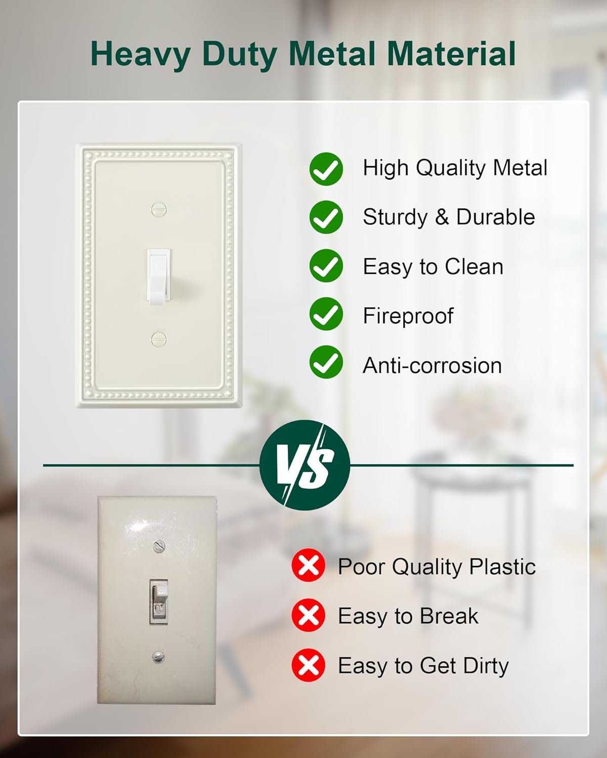 - Durable & Long-lasting - Constructed from high-quality metal, our light almond metal wall plate is built to last. It is resistant to impact, tarnishing, and corrosion, ensuring its durability and longevity. Rest assured that this switch plate covers will remain an attractive addition to your home for years to come.