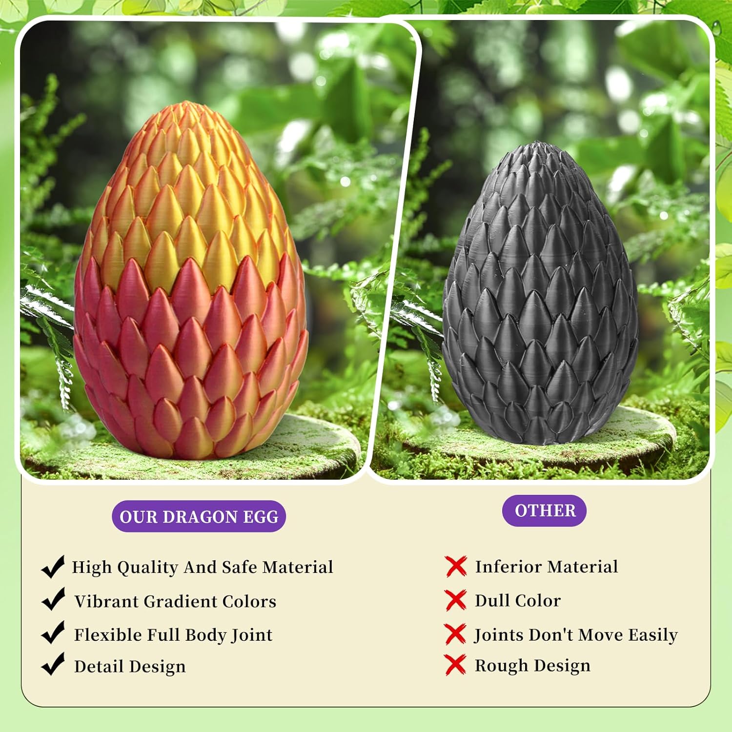 - Created from PLA, a safe and eco-friendly material, this dragon egg and dragon are perfect for everyone and the environment. The meticulously polished fidget dragon toy ensures that it won't scratch your hands or skin.