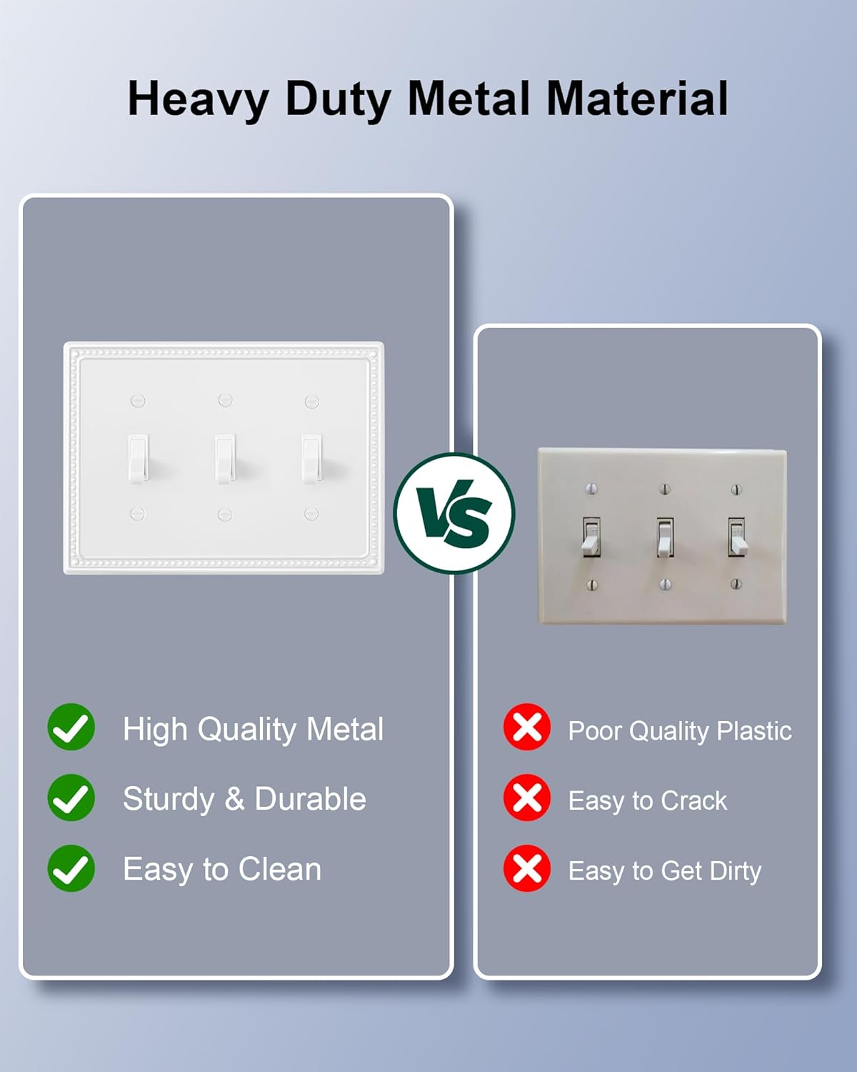 - Specification - Pack of 2 triple toggle metal wall plates, size at 6.81" W*4.92" H. Easy replacement of any wall plate of the same configuration.Backed by a one-year warranty to ensure your peace of mind and complete satisfaction.