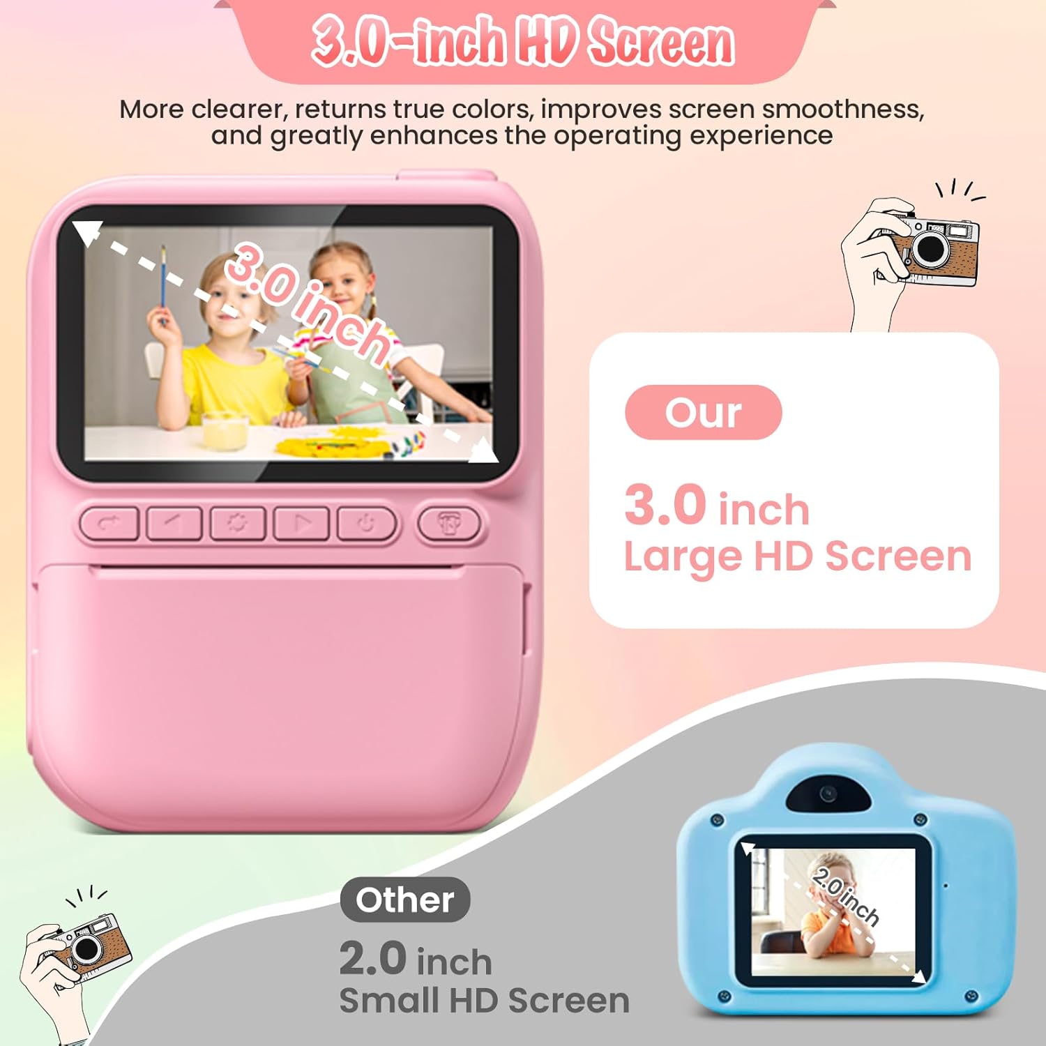 - 【Multifunctional Kids Instant Print Camera 】This kids camera with instant print, 3.0 inch large screen, 32MP HD 1080P video, flash, time lapse, brust shooting, filters frame, mp3, etc. This can meet the different needs of children. Our toddler camera provides endless hours of fun and is a great way to introduce young children to the world of photography