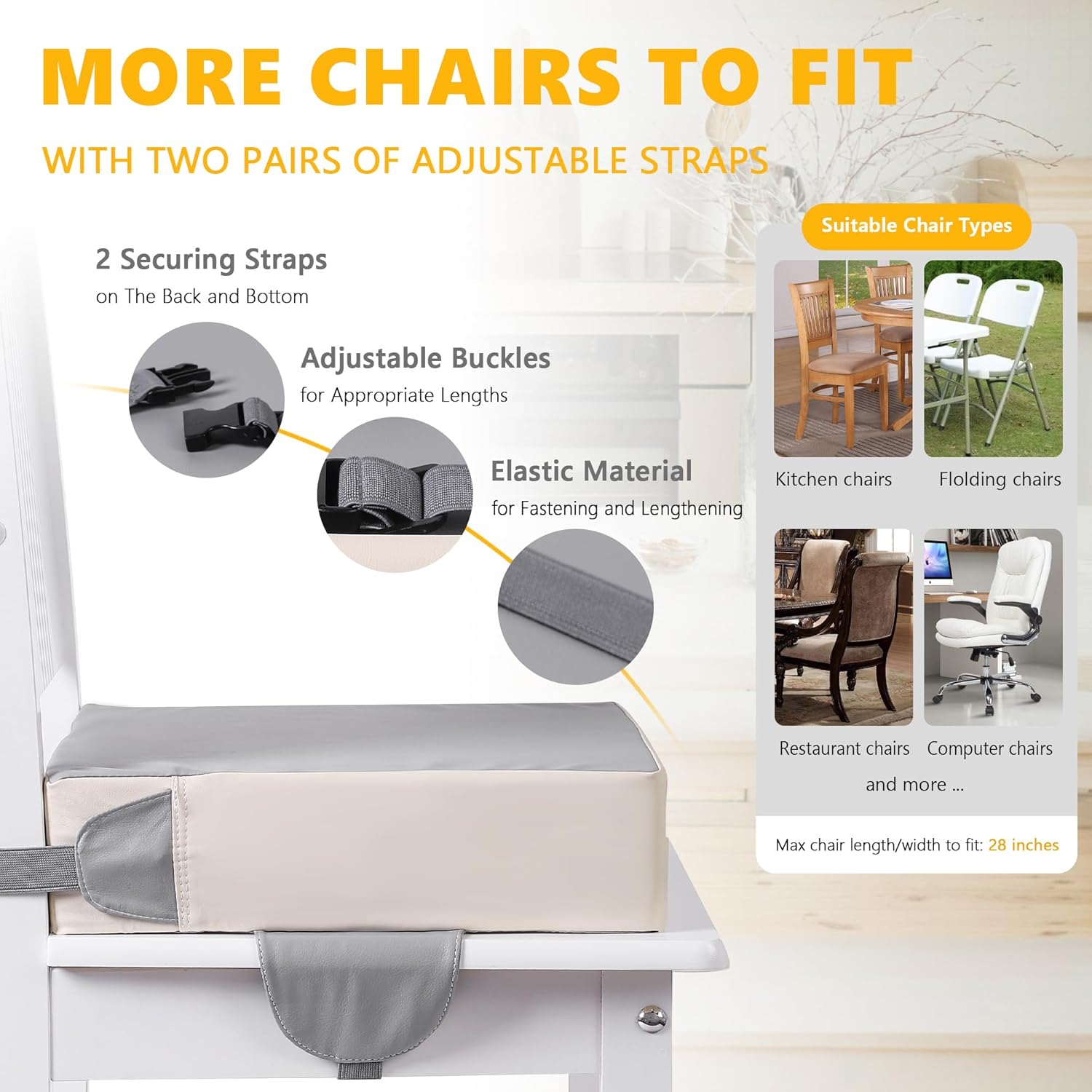 - 【Safety & Anti-slip】The booster seat for table features anti-slip particles and reinforced straps. The anti-slip particles provide excellent resistance to prevent the seat from sliding on the surface of the chair. This ensures your baby stays firmly in place while sitting. The straps add an extra layer of safety, keeping the seat securely fixed to the chair and minimizing the risk of movement. Your baby will be very safe and stable during mealtime or any other activity at the kitchen table.