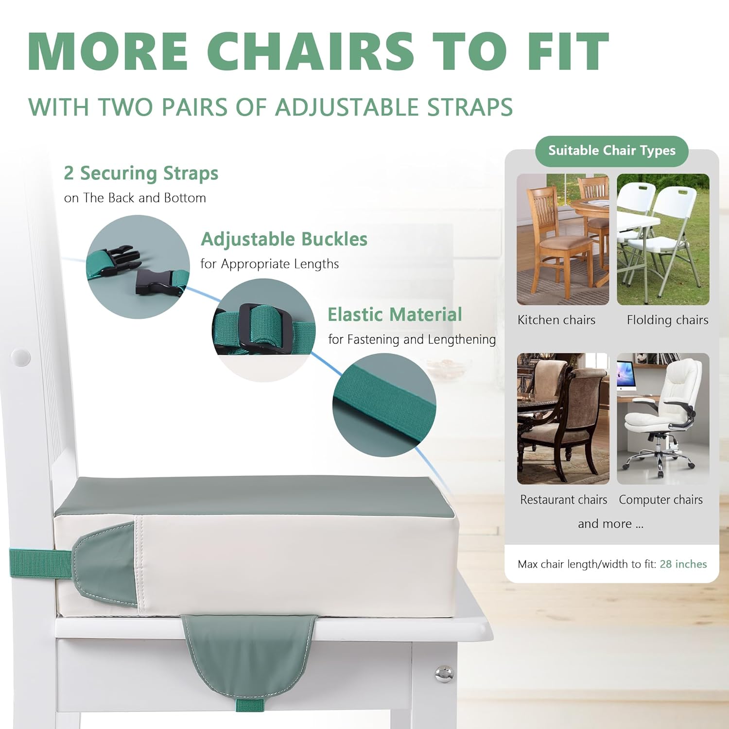 - 【Safety & Anti-slip】The booster seat for table features anti-slip particles and reinforced straps. The anti-slip particles provide excellent resistance to prevent the seat from sliding on the surface of the chair. This ensures your baby stays firmly in place while sitting. The straps add an extra layer of safety, keeping the seat securely fixed to the chair and minimizing the risk of movement. Your baby will be very safe and stable during mealtime or any other activity at the kitchen table.