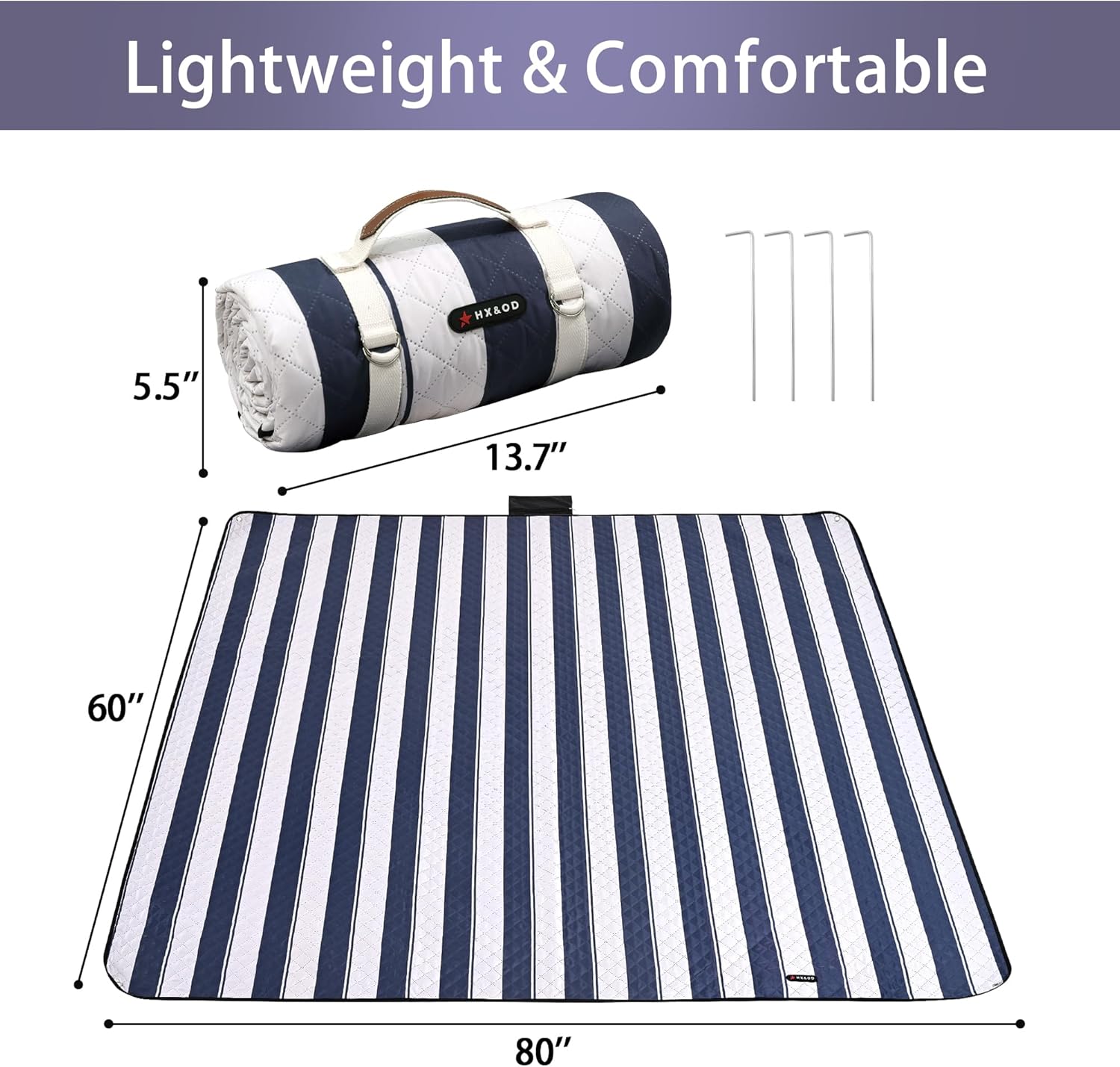 - ☀【Easy to Fold & Lightweight】Large picnic blanket can shrink down to a very portable size of 12"L x 4"W x 4"H. This Picnic blanket with stakes will not loose easily and take too much space. The weight of the mat is only 1.8lbs, you can fold it with simple steps, carry or store it anywhere you want.