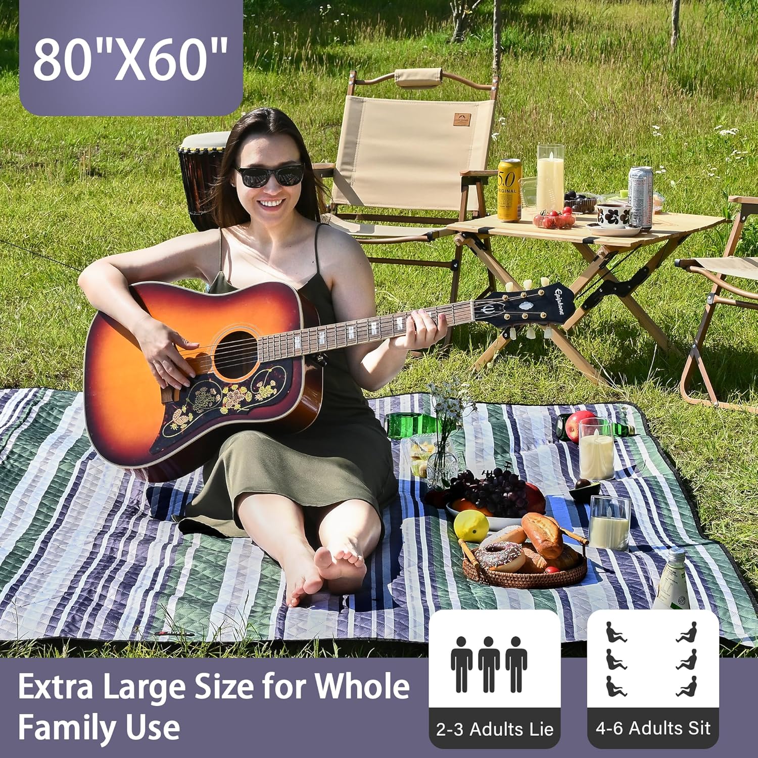• ☀ 【Large size, Portable & Lightweight】- Our Picnic blankets unfoldedsize is 80''x 60''. It’s large enough to fit for 4-6 adults for siting, giving your children and pets a large area to play. This is a windproof picnic mat. Comes with ground spikes to keep the picnic mat from blowing up. Can be used in all seasons.