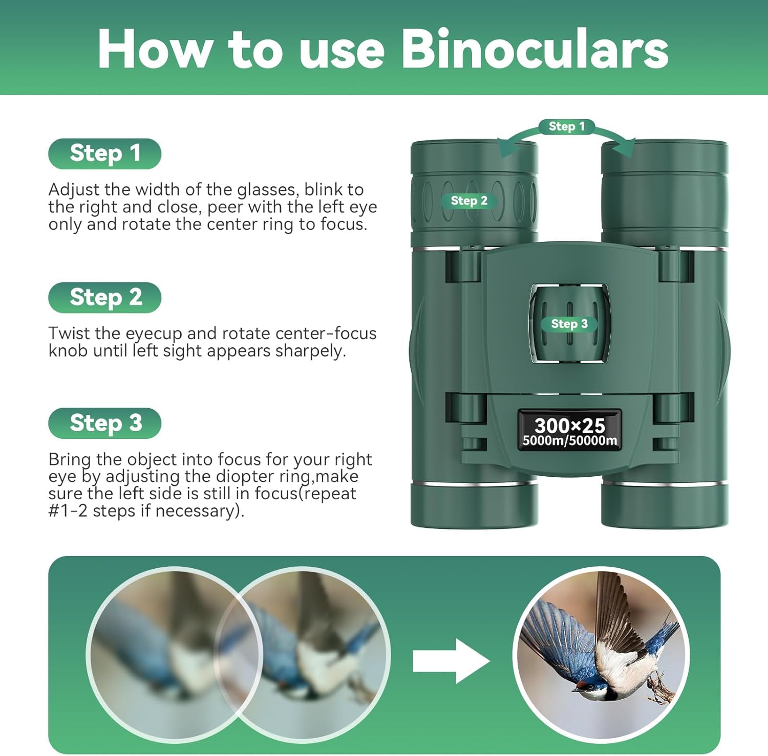 - 300X COMPACT BINOCULARS - Our binoculars are high powered with 300x magnification zoom and a 25mm large field of view, letting you observe and focus on the target in great detail 367ft/1000yds away. It's ideal binoculars for adults and kids, bird watching, hunting, camping, climbing, hiking, safari, travel, opera, concert, and sports events.