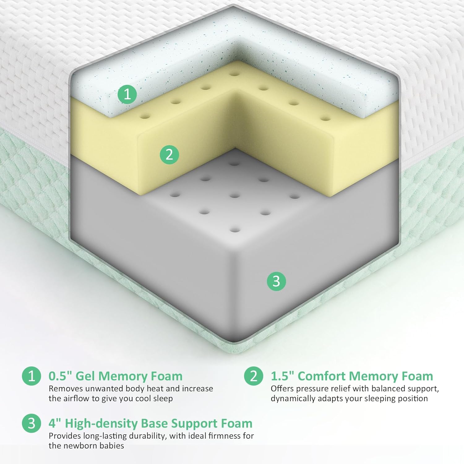- ăBreathable & Comfortable Mattressă Integrated with Gel-infused memory foam, open-cell memory foam and high-density support core, the triple-layered mattress helps to regulate temperature by accelerating air circulation and transferring unwanted heat away from the body, giving your baby a cool and comfortable sleep environment, thus ensures a through-the-night sleep