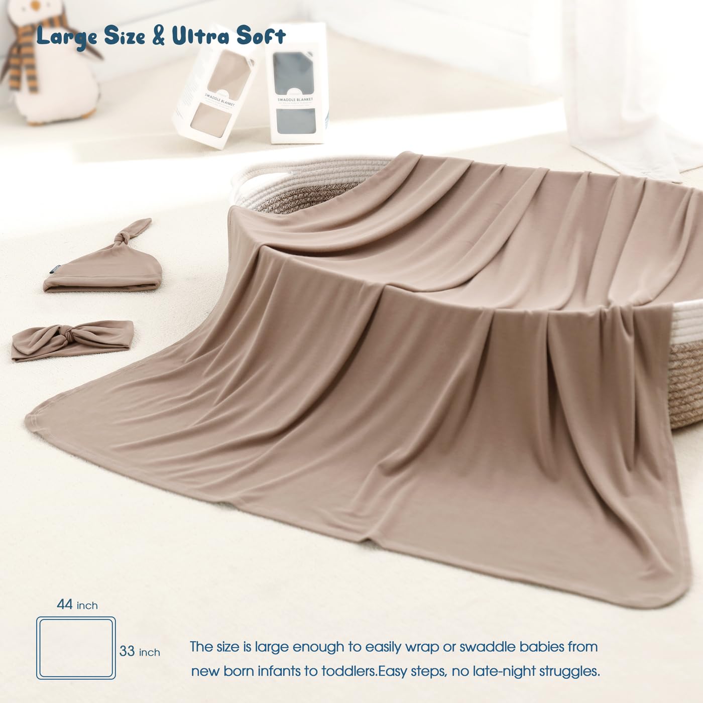 GRSSDER Newborn Swaddle Blanket, Ultra Soft Jersey Receiving Blanket with Matching Headband and Beanie Set 33×44", Stretchy Baby Neutral Swaddle Wrap for Girls and Boys