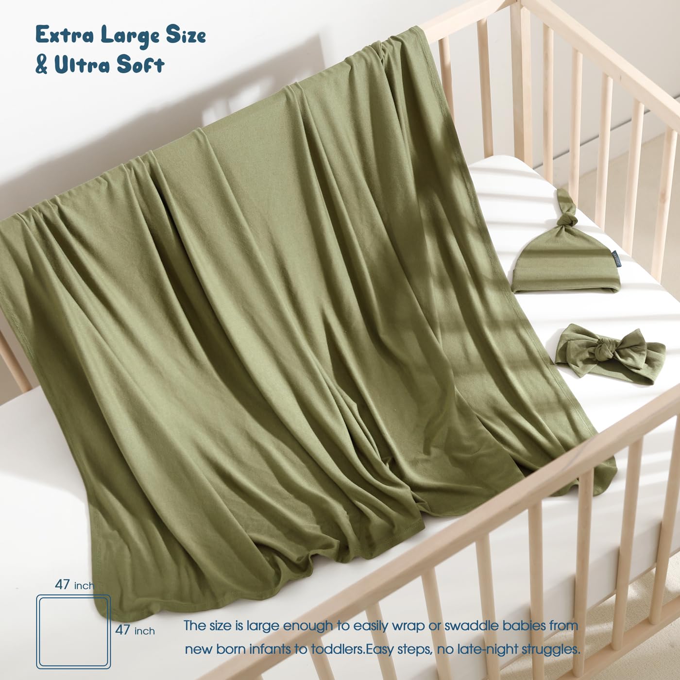 GRSSDER Newborn Swaddle Blanket, Ultra Soft Jersey Receiving Blanket with Matching Headband and Beanie Set, 47×47" Extra Large Nursery Swaddle Wrap for Girls and Boys