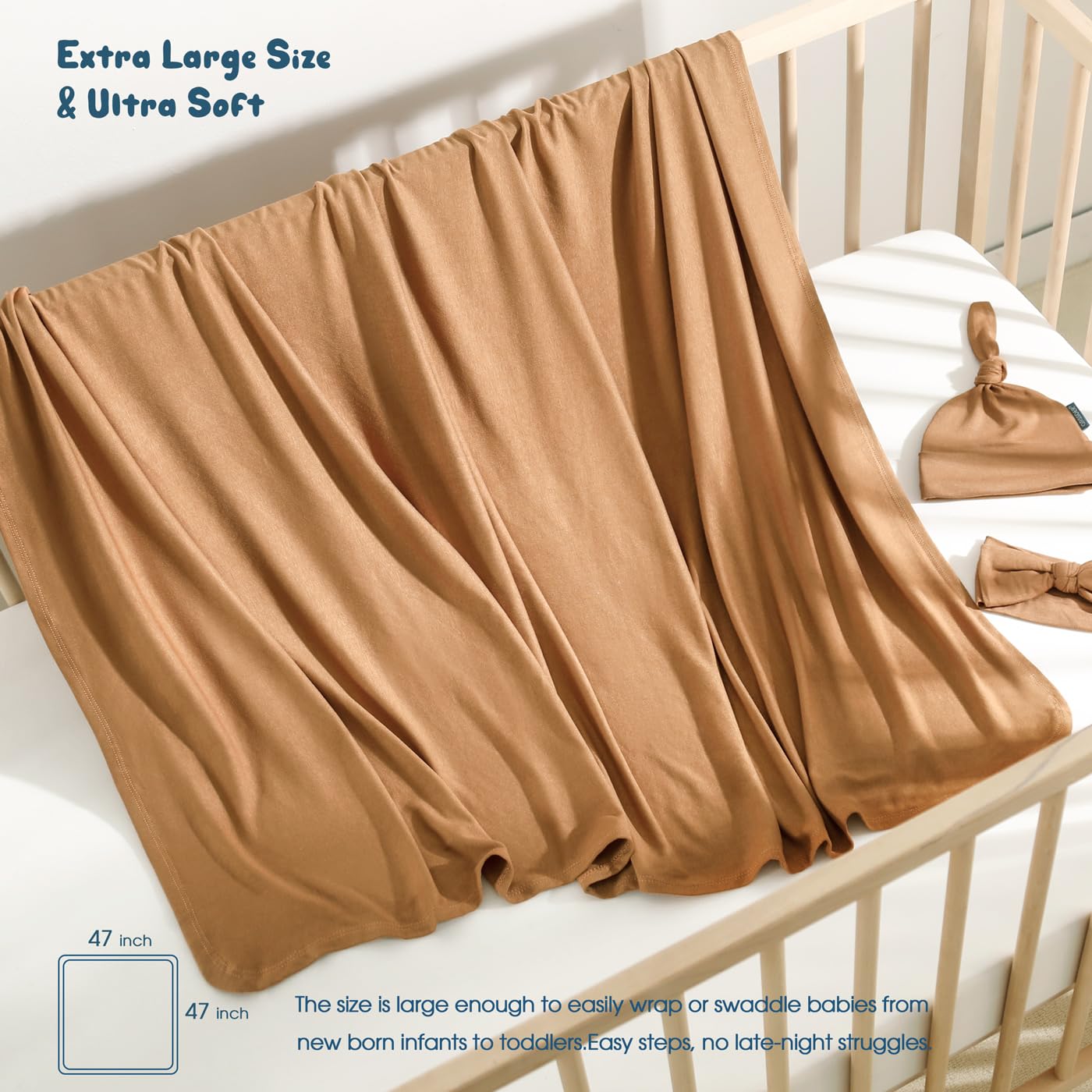 GRSSDER Newborn Swaddle Blanket, Ultra Soft Jersey Receiving Blanket with Matching Headband and Beanie Set, 47×47" Extra Large Nursery Swaddle Wrap for Girls and Boys