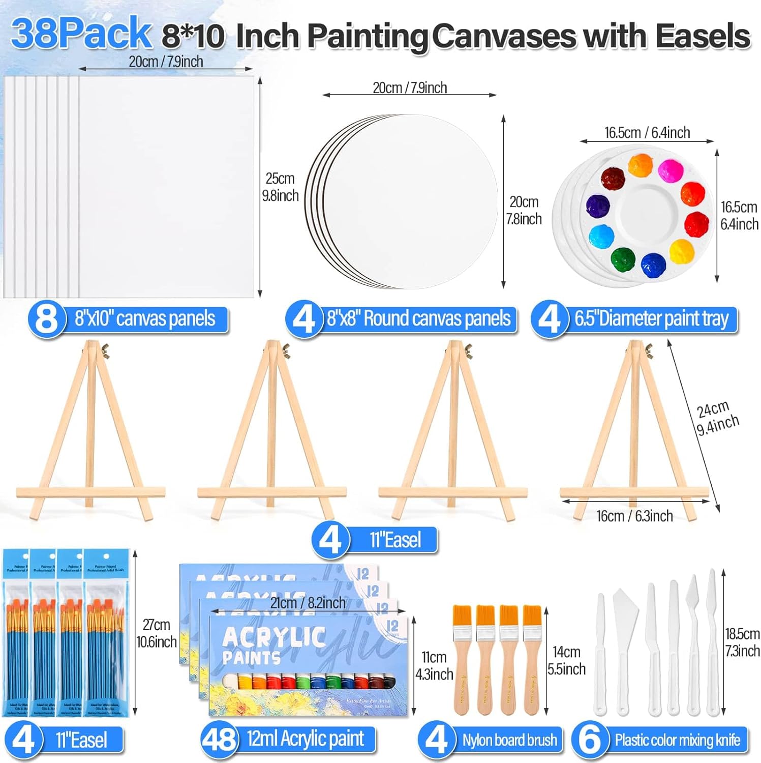 - Canvas Painting Kit for Adults: The professional acrylic paint kit includes 8PCS 8x10 inch canvas boards, 4 PCS round canvas for painting, 4PCS wooden easels, 4*12color acrylic paint set, 4PCS paint palettes, 4PCS 1" flat brushes, 6PCS palette knives and 4*10PCS paint brushes set. A complete painting kit for couples sip and paint date night provides a diverse range of creative tools to meet all your painting supplies needs