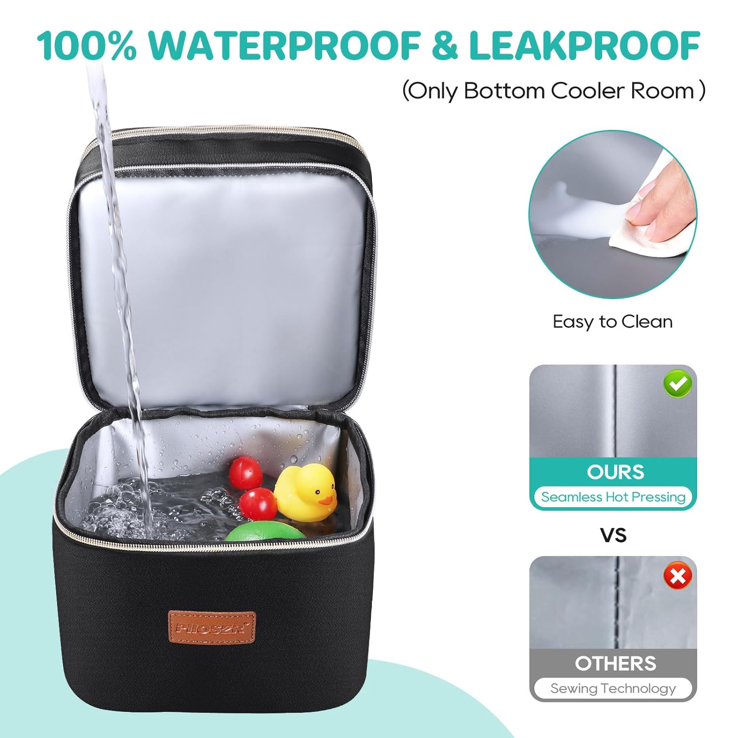 - Double Layer & Dual Compartment Design: The bottom cooler room with an ice pack that will keep breastmilk, drinks, or baby food fresh for hours. And it can fits 4 large baby bottles up to 5 ounces. The top compartment layer provides some space and you can breastmilk storage bags, baby squeeze pouches, baby snack container box or baby food storage jars...